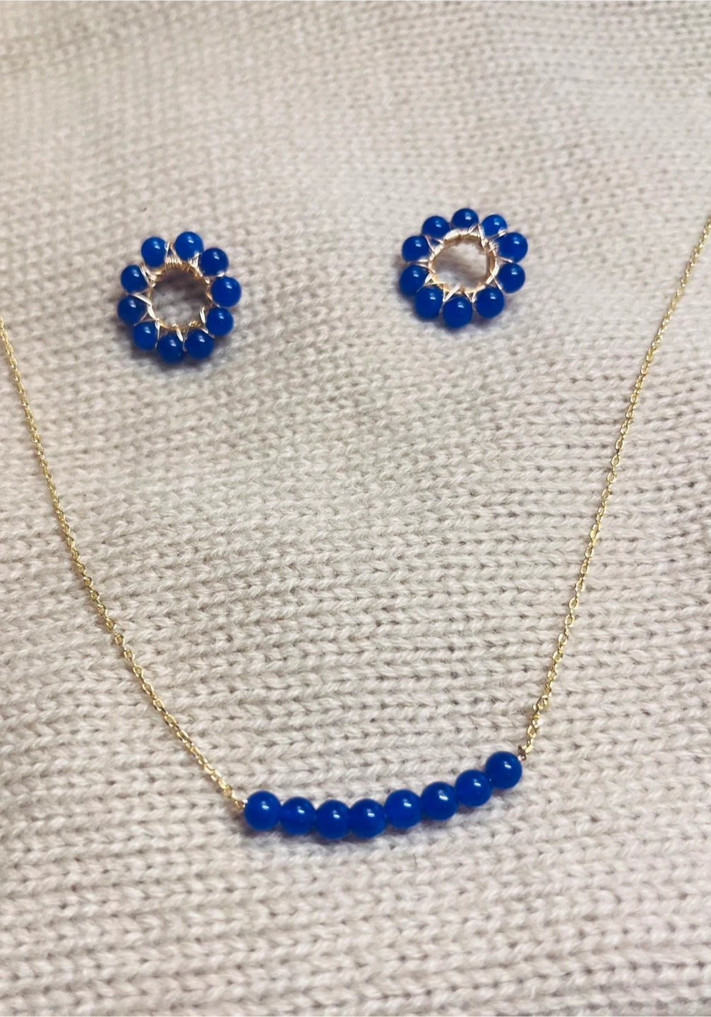 70A lovely matching set featuring a delicate gold-tone necklace with blue beads and a pair of matching blue beaded earrings! Perfect for adding a pop of colour to any outfit