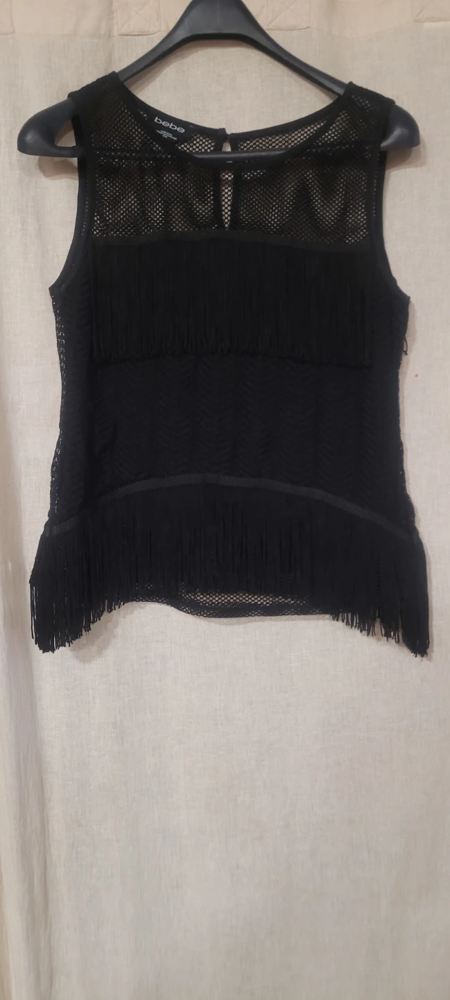 Here's a stylish Bebe black sleeveless top with a fun fringe design! It's perfect for adding a bit of flair to your outfit. The top features a mesh neckline and a unique layered fringe detail. A great addition to any wardrobe!