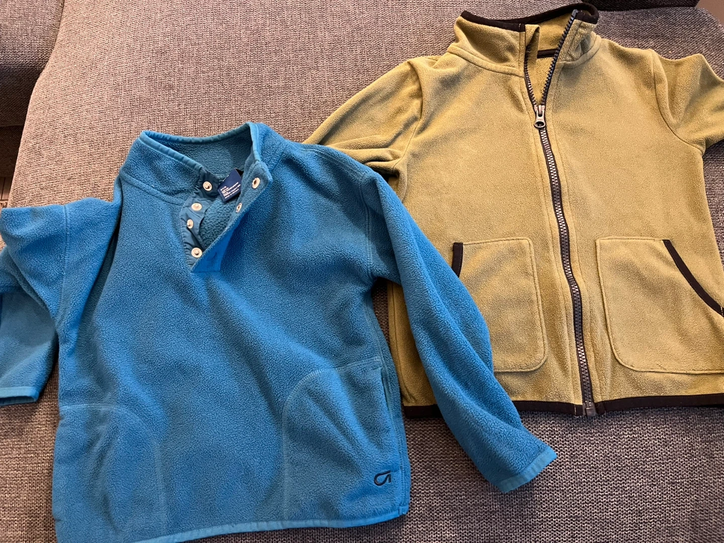 Selling two cozy toddler fleece tops. One is a Joe Fresh zip-up hoodie in size 5 in a nice olive colour. The other is a GapFit pullover in royal blue size 5Y/4. Both are in great condition and perfect for keeping your little one warm! $7 each.