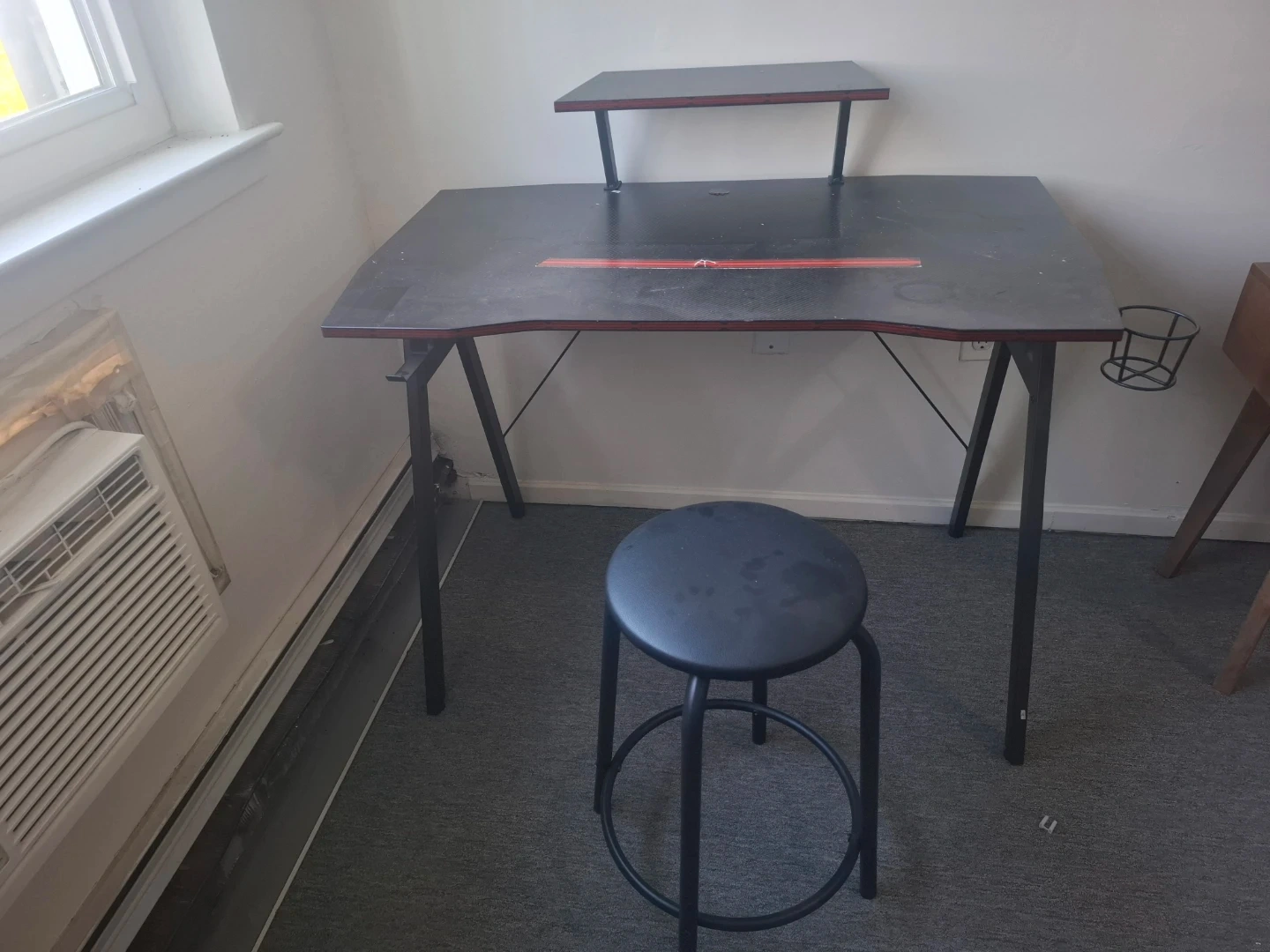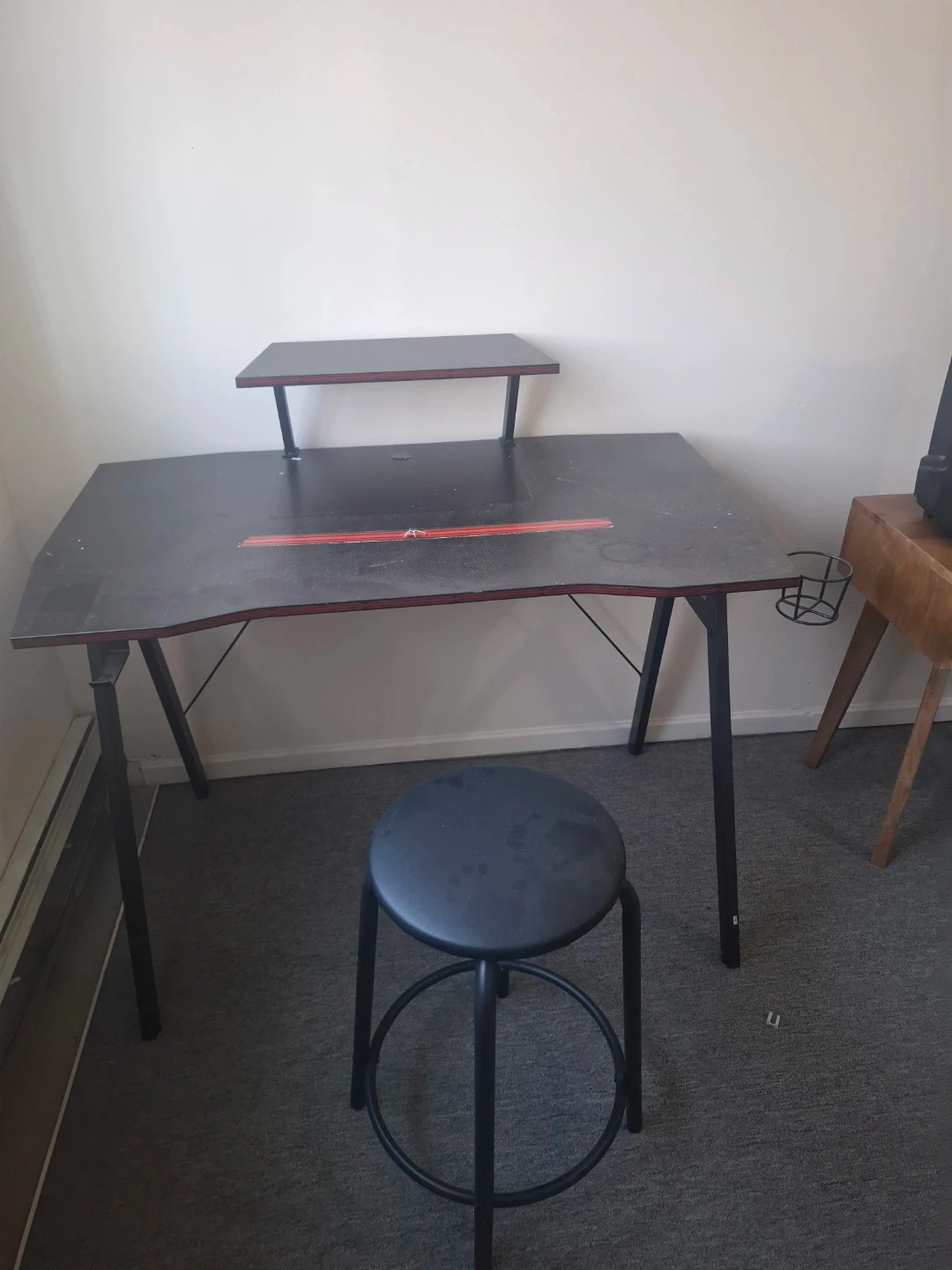 Selling a gaming desk with a stool. It features a raised monitor shelf and a cup holder. The desk has a black surface with a red accent stripe. The stool is also black and appears to be in good condition. Great for setting up your gaming station!included the chair