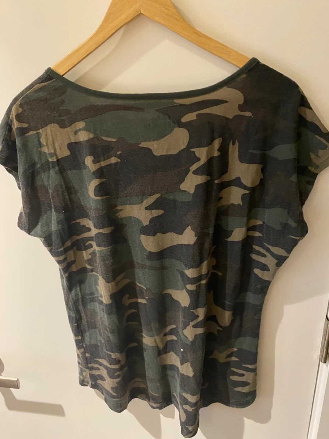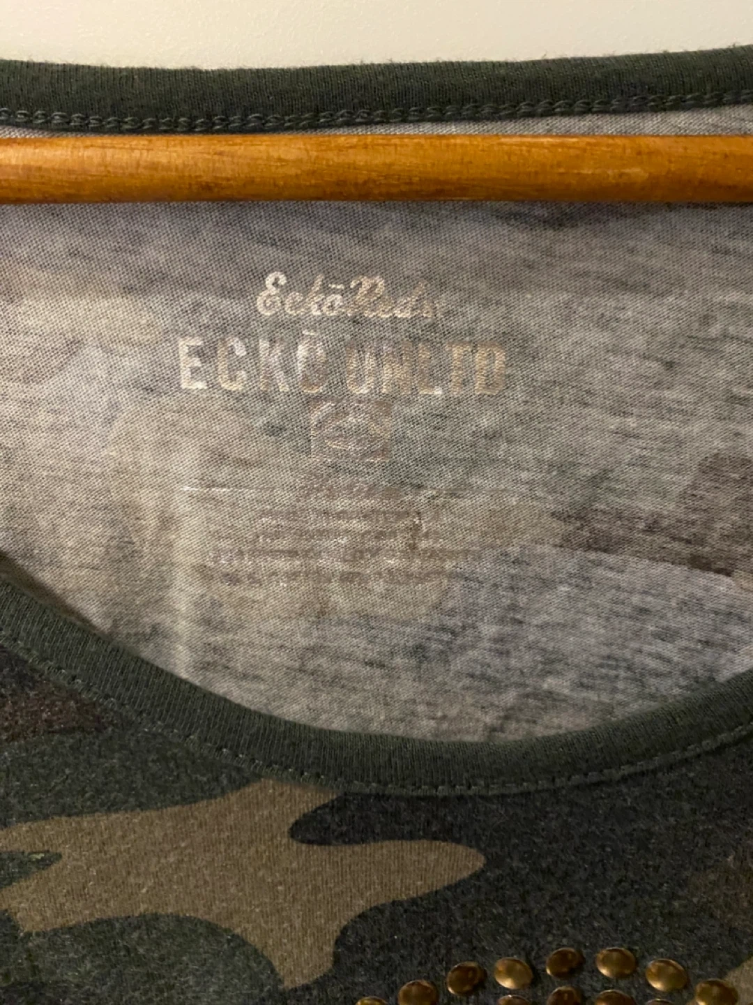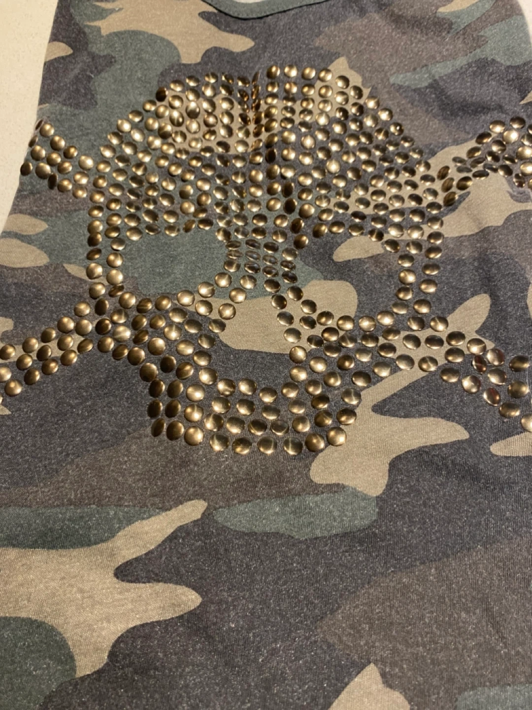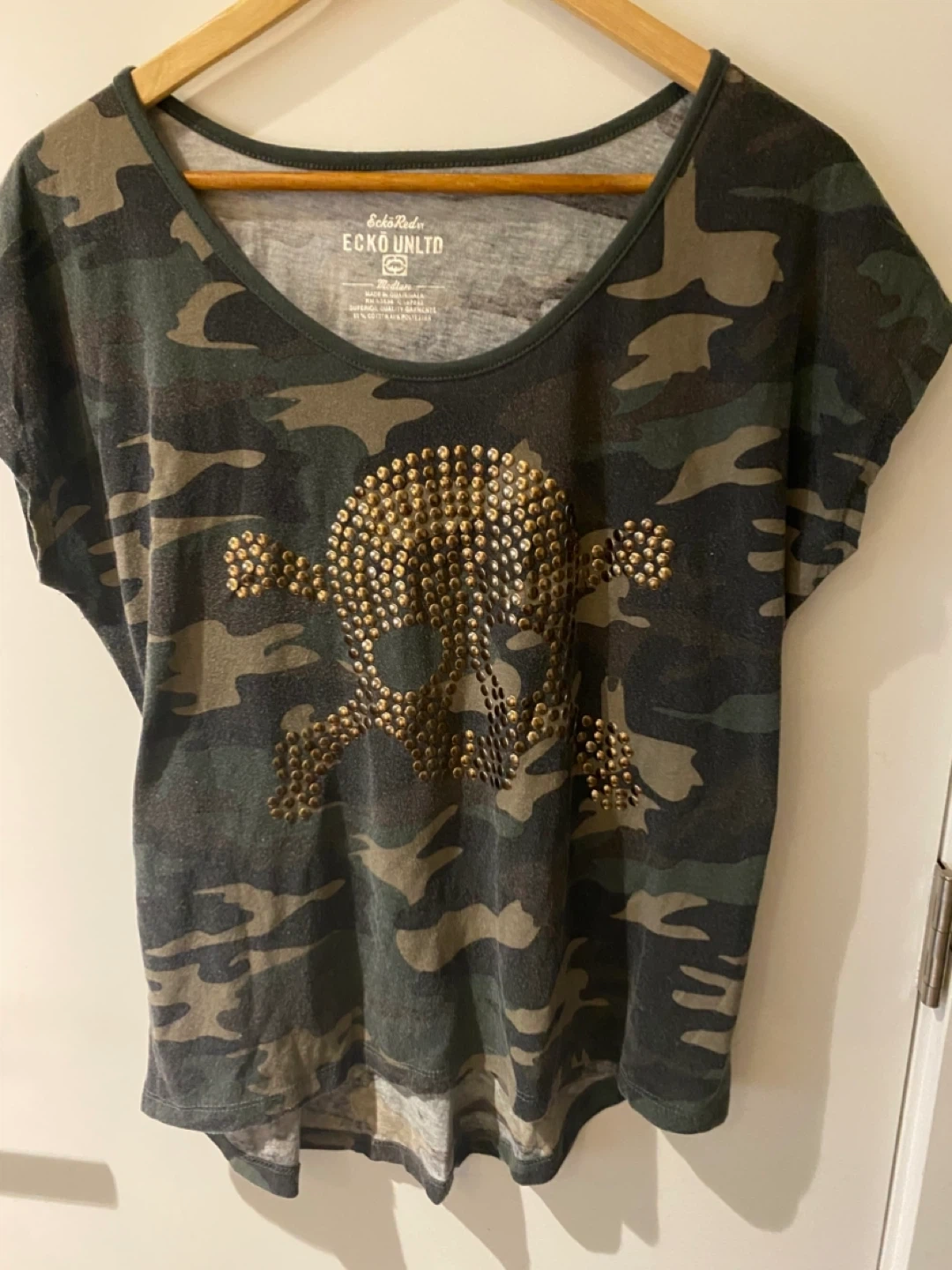 Selling an Ecko Unltd camo t-shirt! It features a skull design made of gold studs on the front. The shirt is in good condition and would be a great addition to your wardrobe