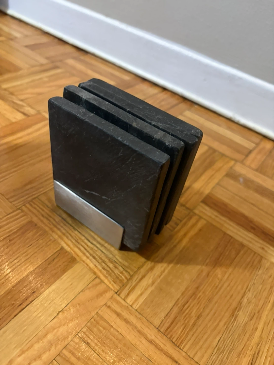 SET OF 4 COASTERS WITH CADDY, DARK MARBLE/SILVER
