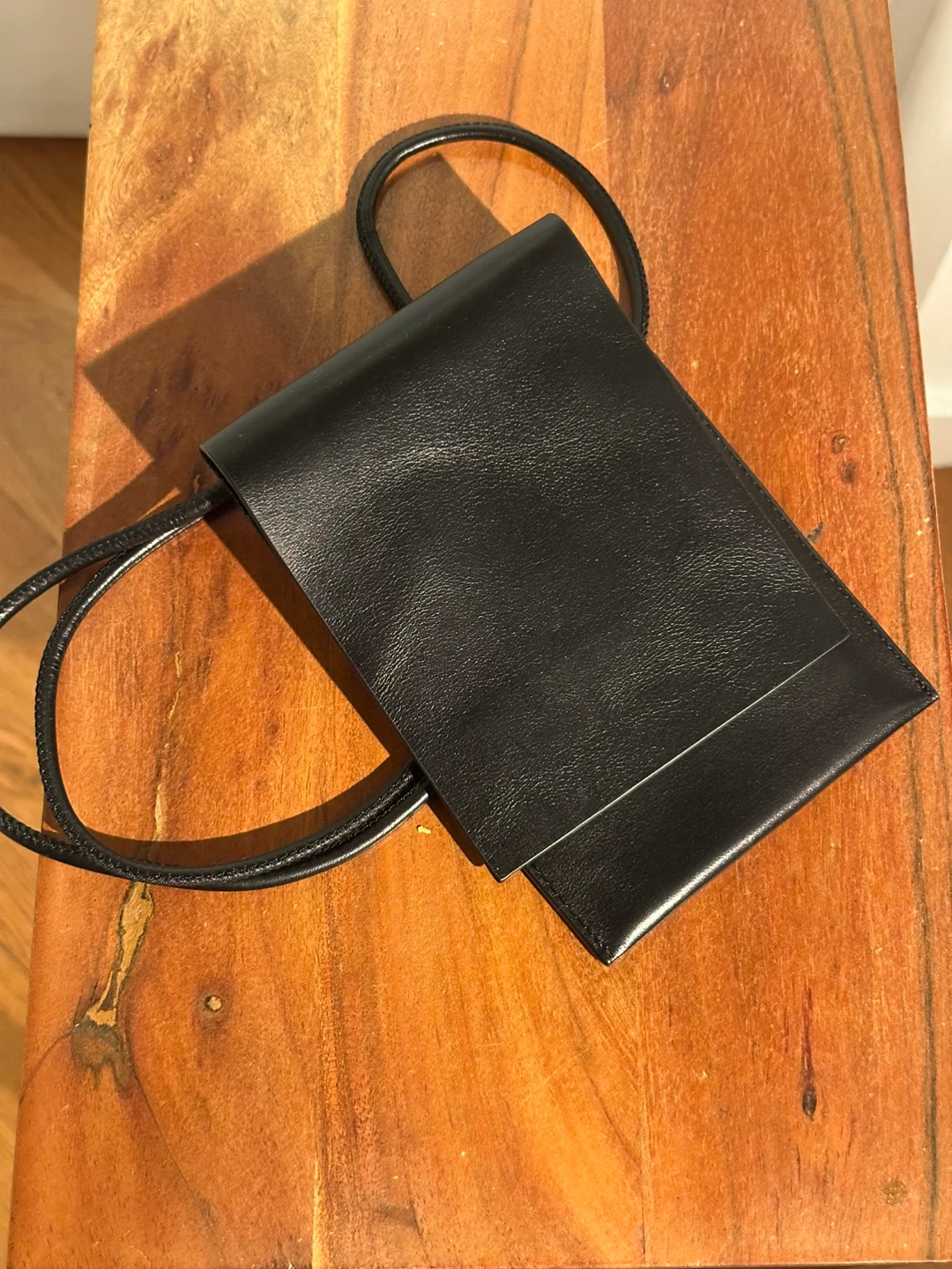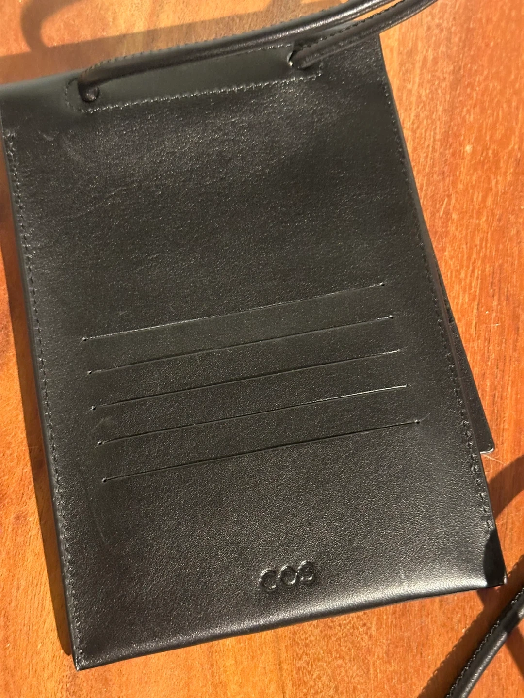 This is a sleek black leather phone pouch from COS. It's in great condition and perfect for carrying your phone and a few cards! The minimalist design is super stylish and practical