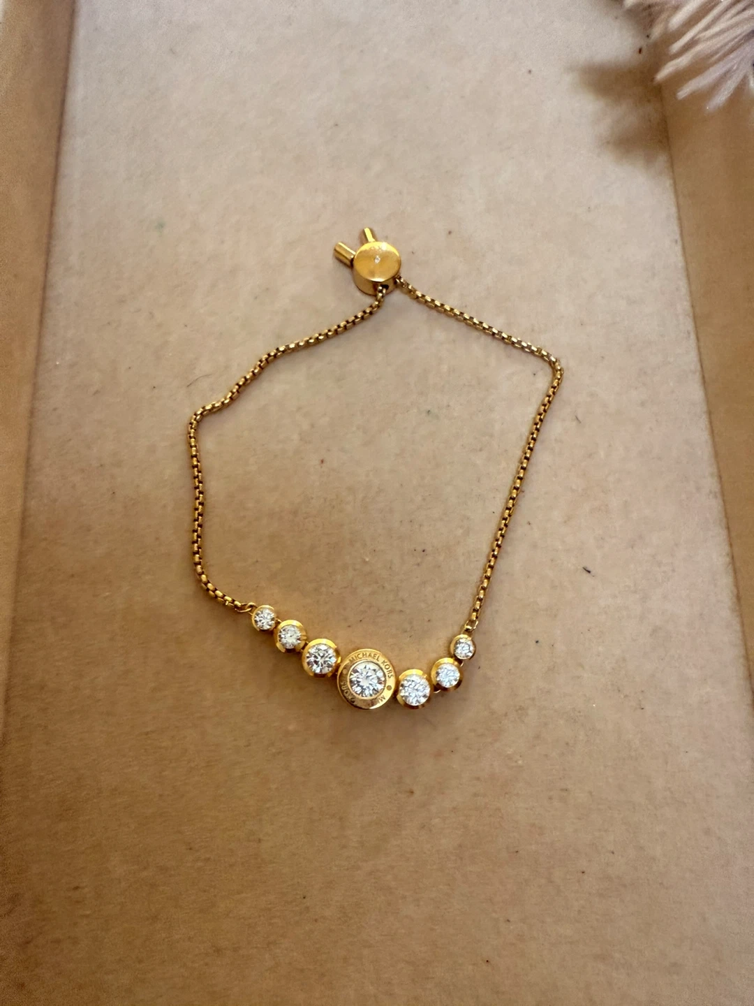 This is a Michael Kors gold-tone slider bracelet with crystal accents. It's in excellent condition and would make a lovely addition to any jewellery collection. The bracelet features a delicate chain with a slider closure for an adjustable fit.