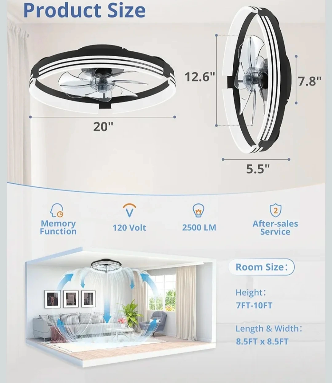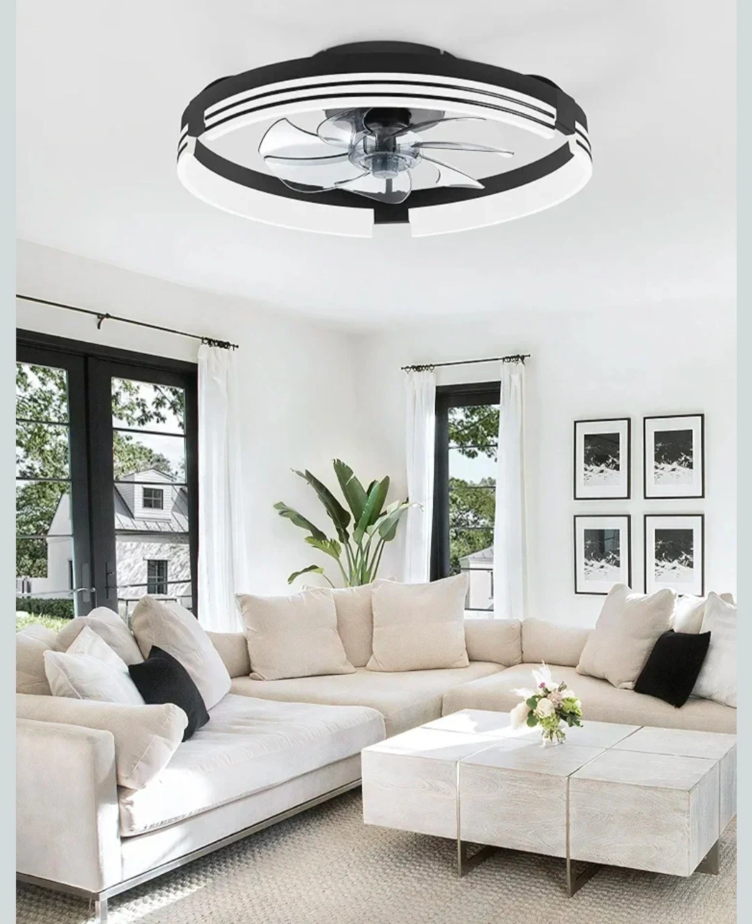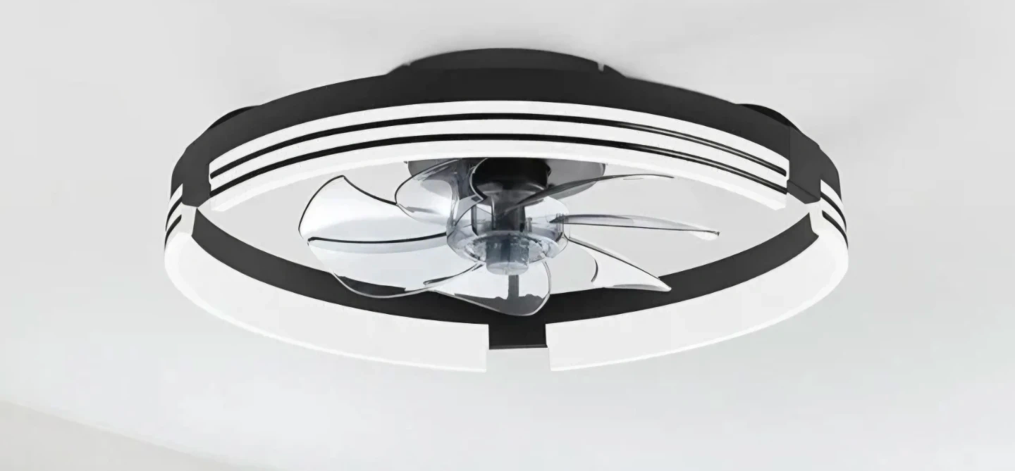 Modern LED ceiling fan with a light. It features a sleek design with a black and white finish. Remote and App control. 6 wind speeds. Reversible Motor And Quiet Fan.