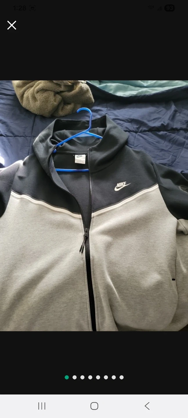 Selling a Nike Tech Fleece full-zip hoodie in gray and black. It's in great condition and ready for a new home! Perfect for layering or wearing on its own.