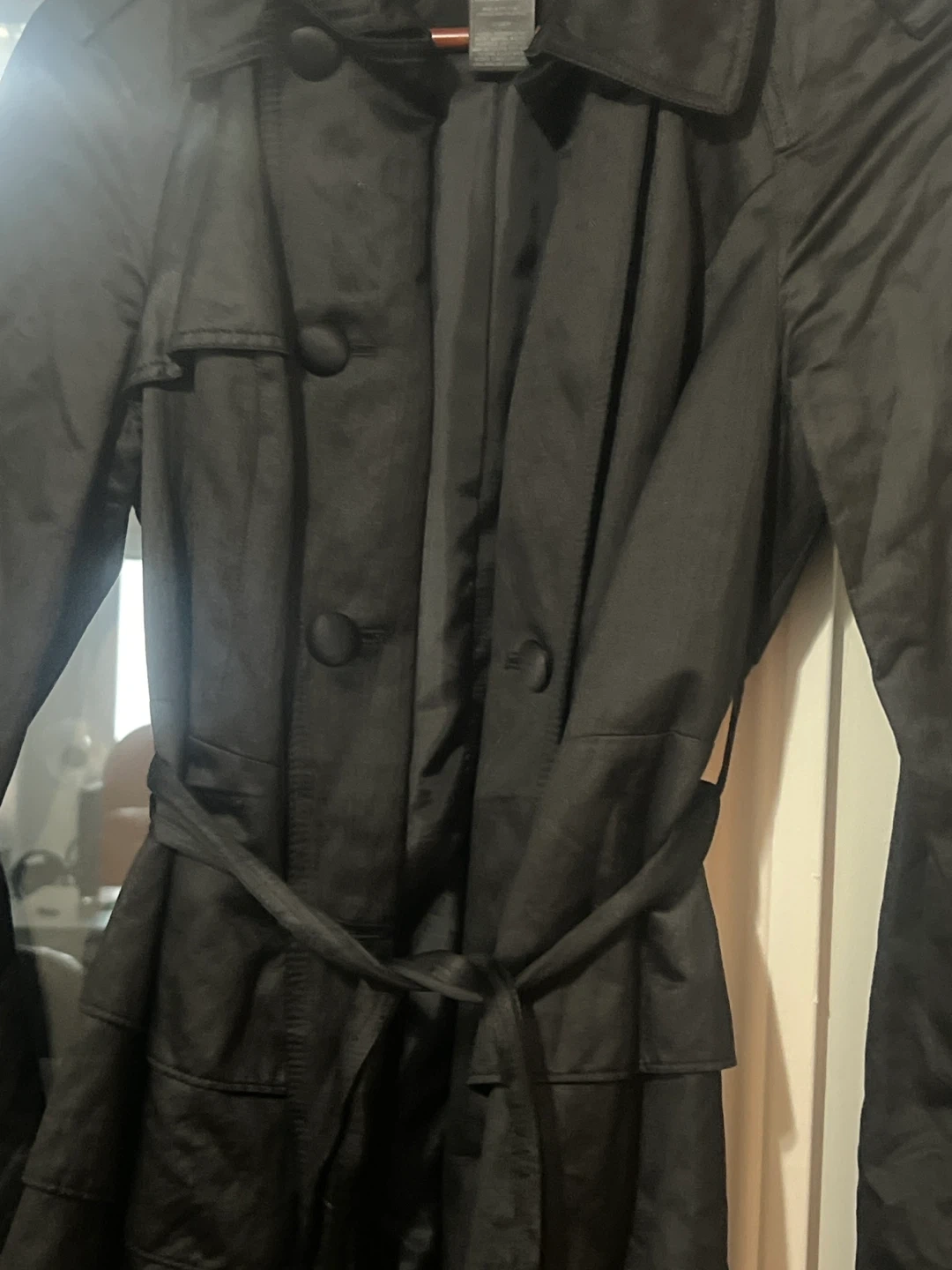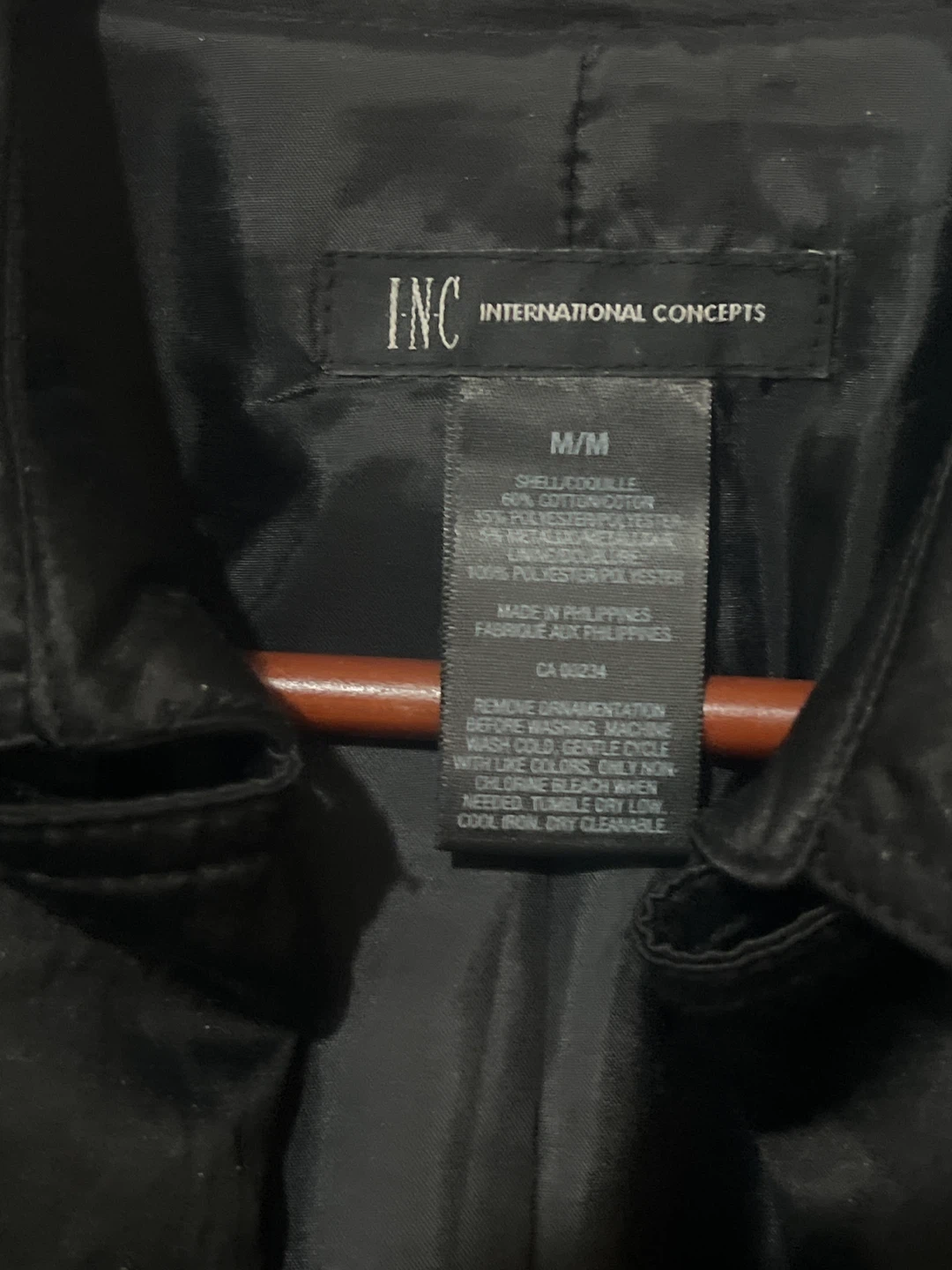 Selling a stylish black trench coat from INC International Concepts. It's a size M/M and made of a blend of cotton, polyester, and metallic materials. Perfect for adding a touch of elegance to your wardrobe!