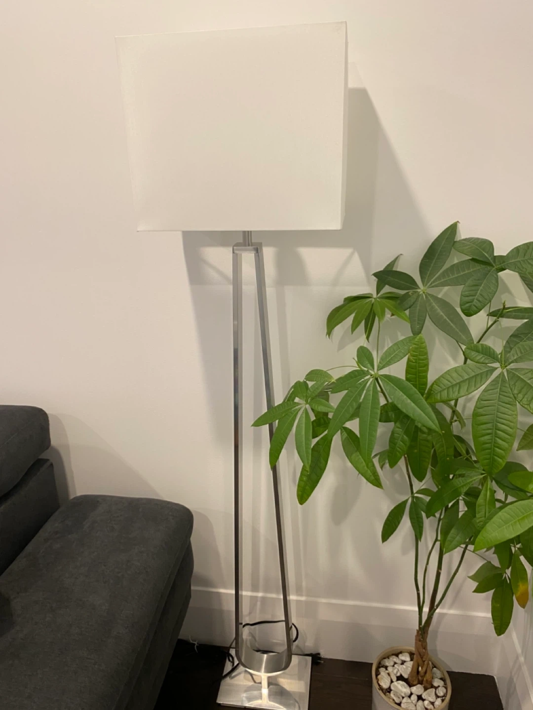 Selling a modern-style floor lamp! It features a sleek silver frame and a crisp white shade. It's in great condition and would look lovely in any living room or bedroom. Can deliver in Toronto for $ 6 dollars extra.
