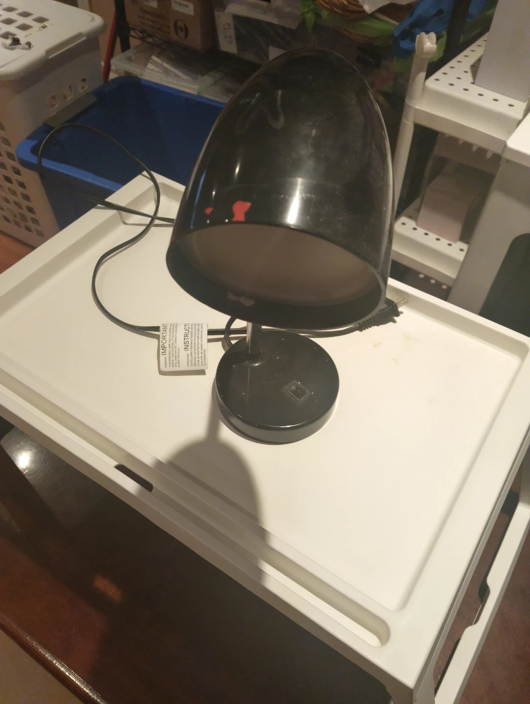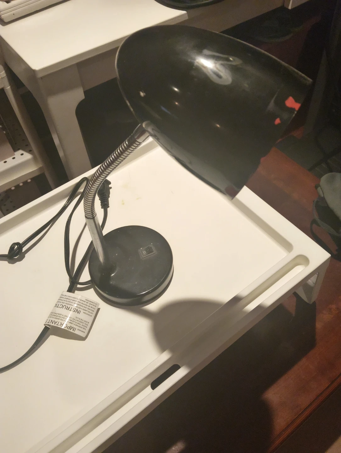 Selling a black desk lamp in good condition. It's perfect for a desk or bedside table and provides great lighting for reading or working. It has an adjustable neck so you can direct the light where you need it