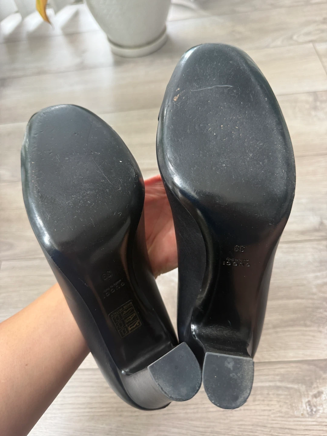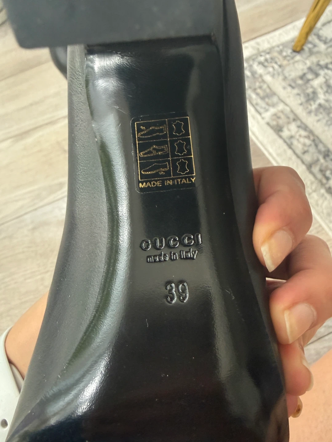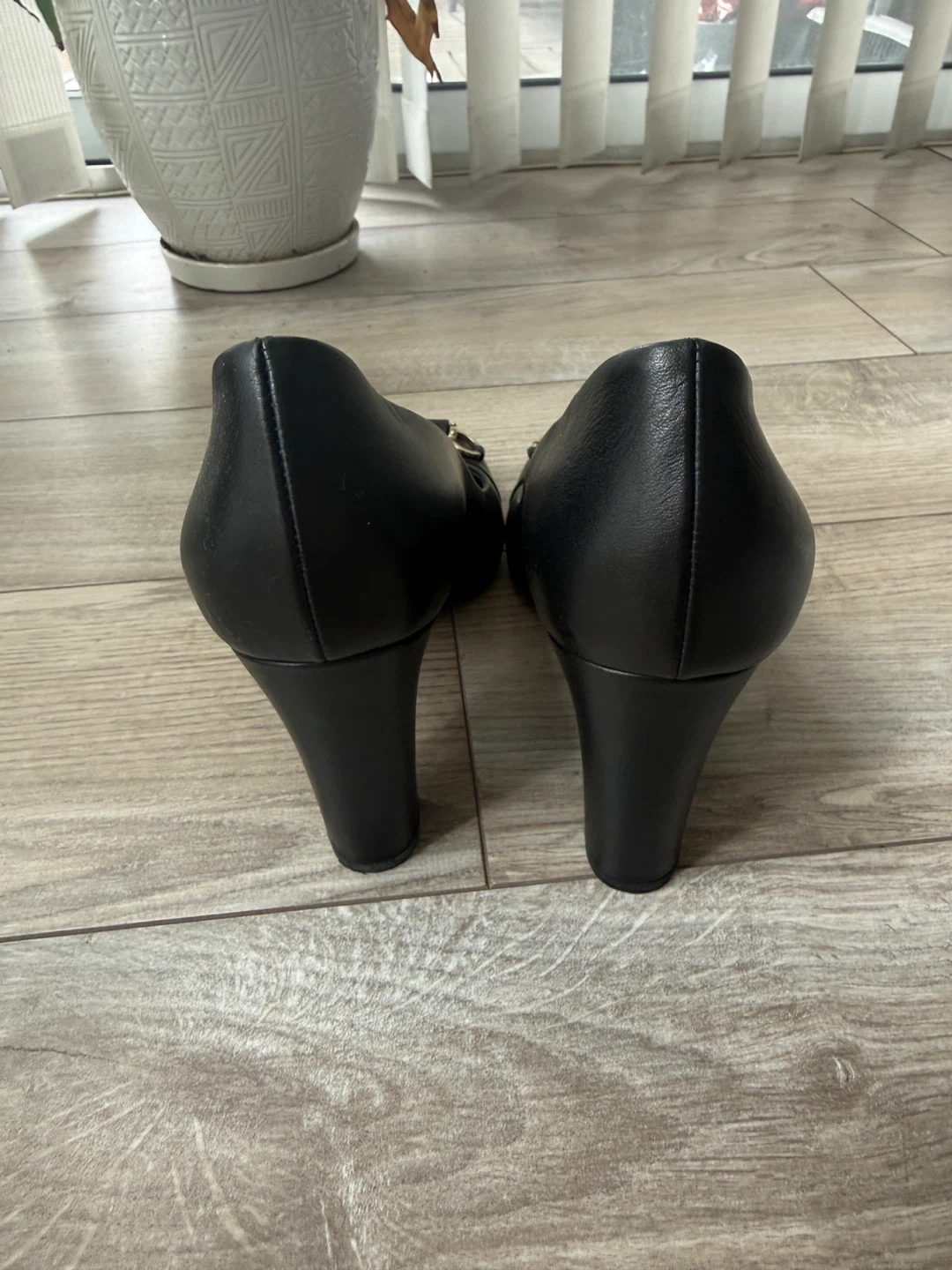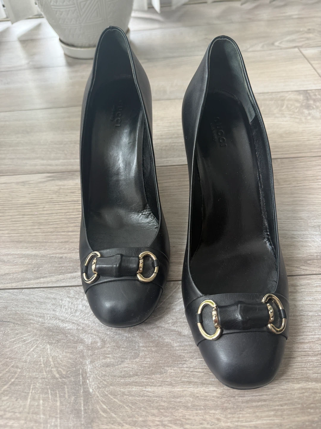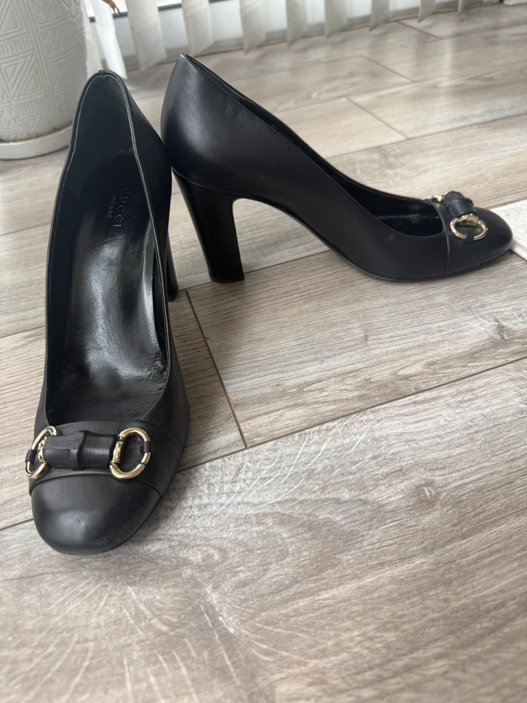 Selling a pair of vintage Gucci black leather heels. They are a size 39. The heels have a classic design with a gold-tone accent. Perfect for adding a touch of elegance to any outfit! These are vintage and come without dust bag and box.
