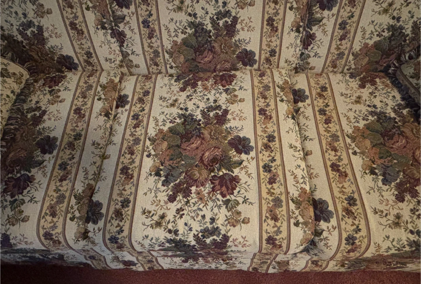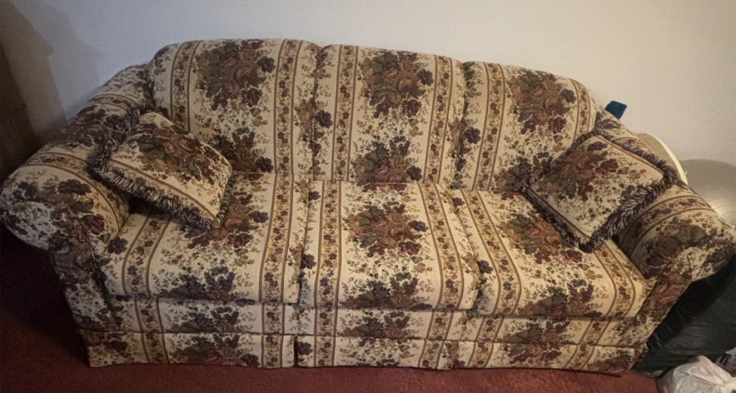 Selling a lovely sofa with a unique floral pattern! It comes with matching pillows, making it a cozy addition to any living room. It's in good condition and ready for a new home.