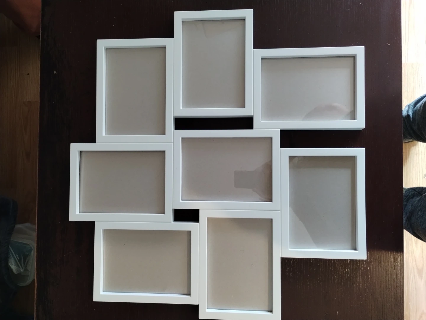 Here's a white collage picture frame with 7 openings! It's perfect for displaying multiple photos in one frame. It's in great condition and ready to add a personal touch to your home decor