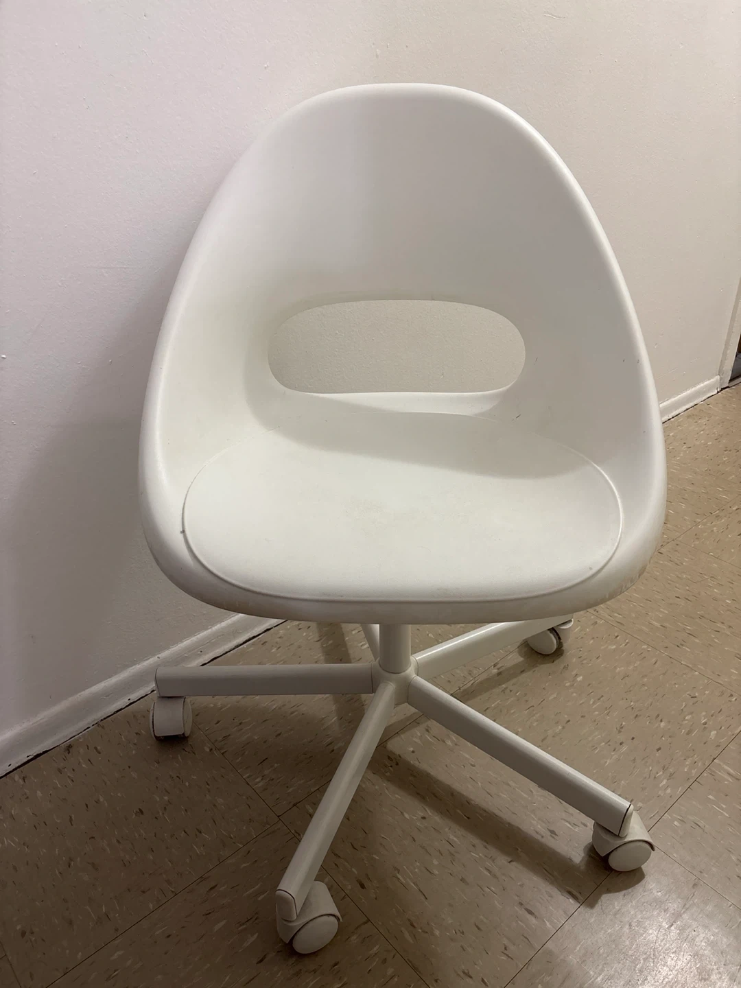Selling a white swivel desk chair! It has a unique design with a cutout in the back. It's perfect for a home office or study space. It has some signs of use.