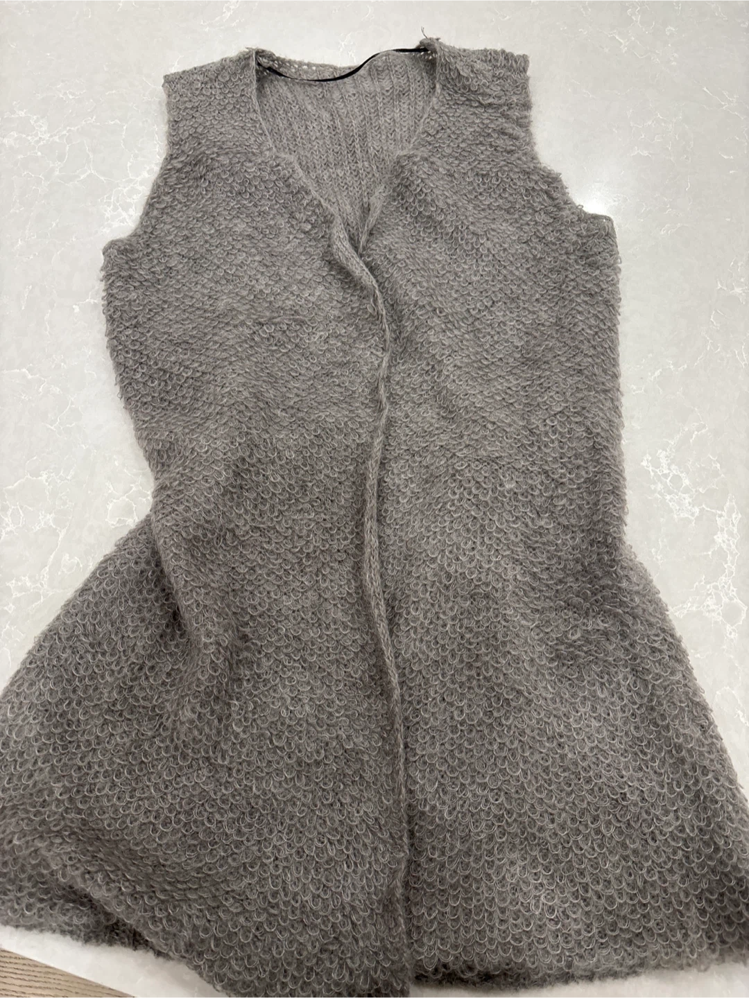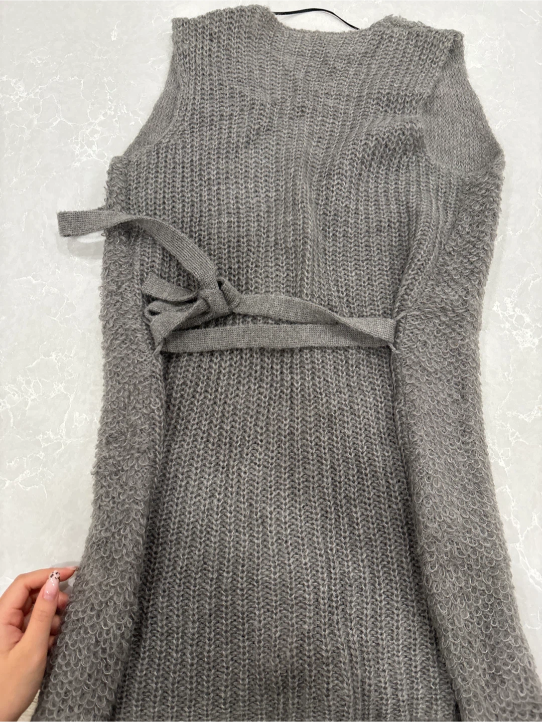 Selling a cozy grey knit vest, size small. It's in great condition and perfect for layering! The material is soft and comfortable, ideal for adding a touch of warmth to any outfit. It features a tie at the back to cinch the waist.