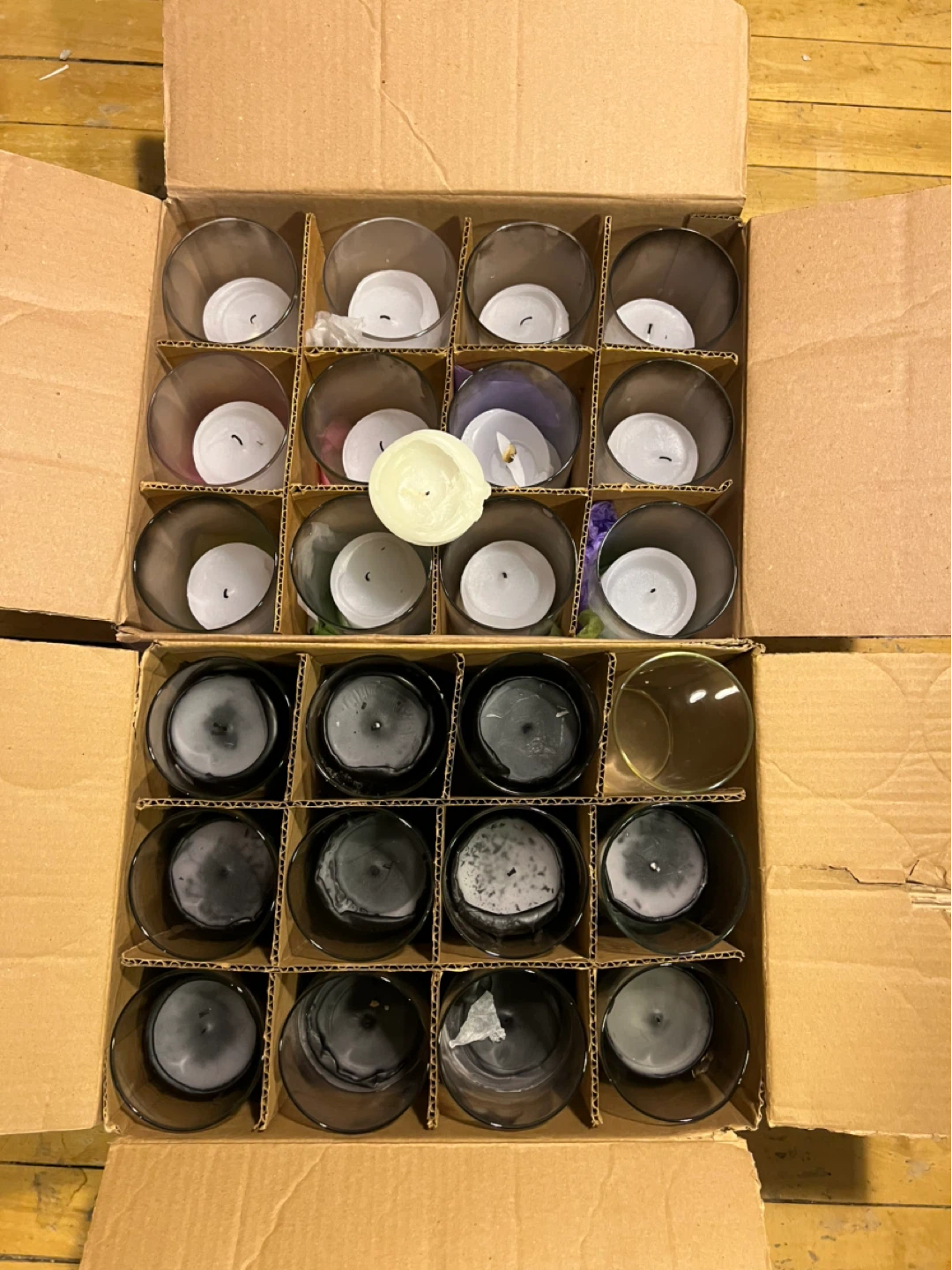 Selling a set of used pillar candles in glass hurricane holders. The tall candles are black on the outside and white on the inside, and the shorter cancels are all white some of them melted into the candle holders more than others (see photos). Tall vases are 7.5 inches and short vases are 6 inches.