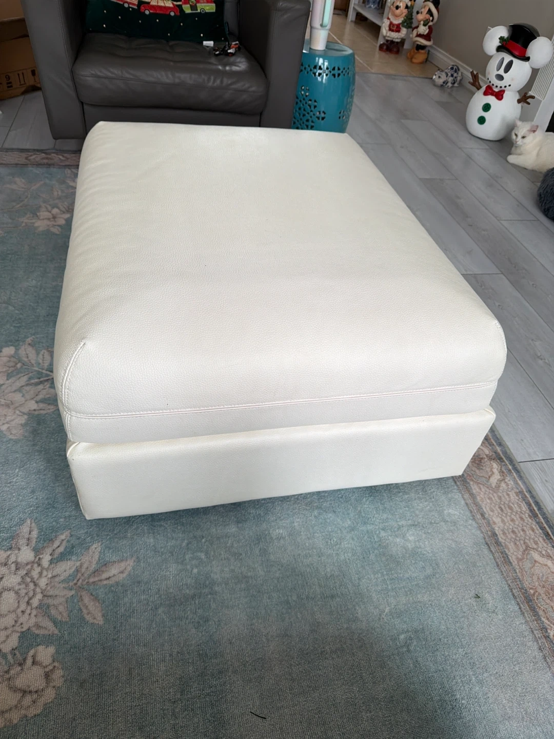 Selling a comfy white leather ottoman. It's in great shape and would look great in any living room or bedroom! The material is soft and the ottoman is very sturdy. It's perfect for kicking your feet up after a long day