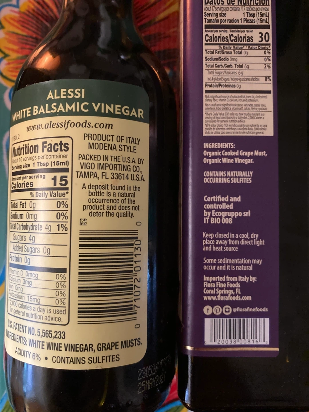 2 bottles of balsamic vinegar. One is Alessi Autentico Premium Aceto Balsamico Bianco (White Balsamic Vinegar) 8.5 fl oz (250 mL). The other is Flora Imported Balsamic Vinegar of Modena Organic 8.5 fl oz (250mL). Great for salads or cooking!