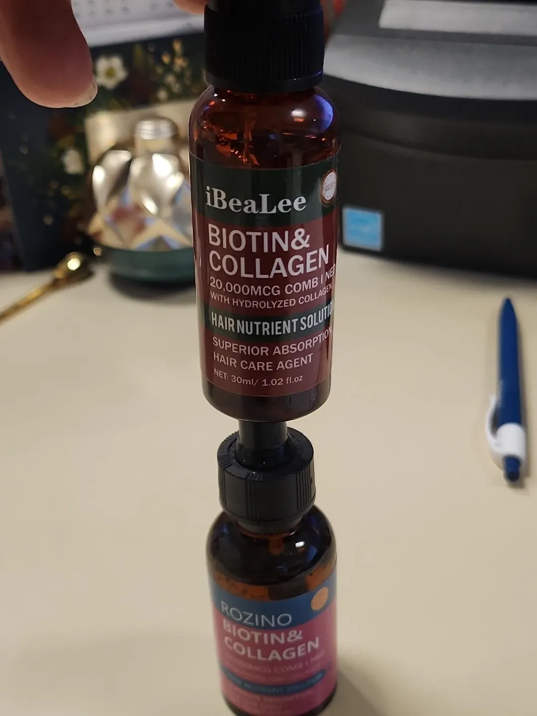 Selling a set of 2 bottles of iBeaLee Biotin & Collagen hair nutrient solution. It contains 20,000mcg combined with hydrolyzed collagen for superior absorption. The bottle contains 30ml/1.02 fl.oz of product.
