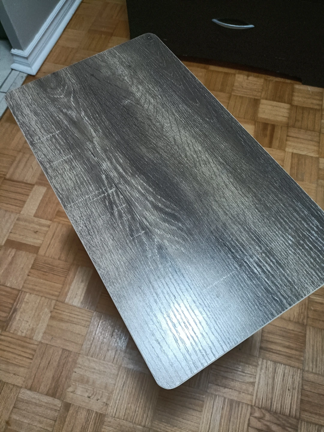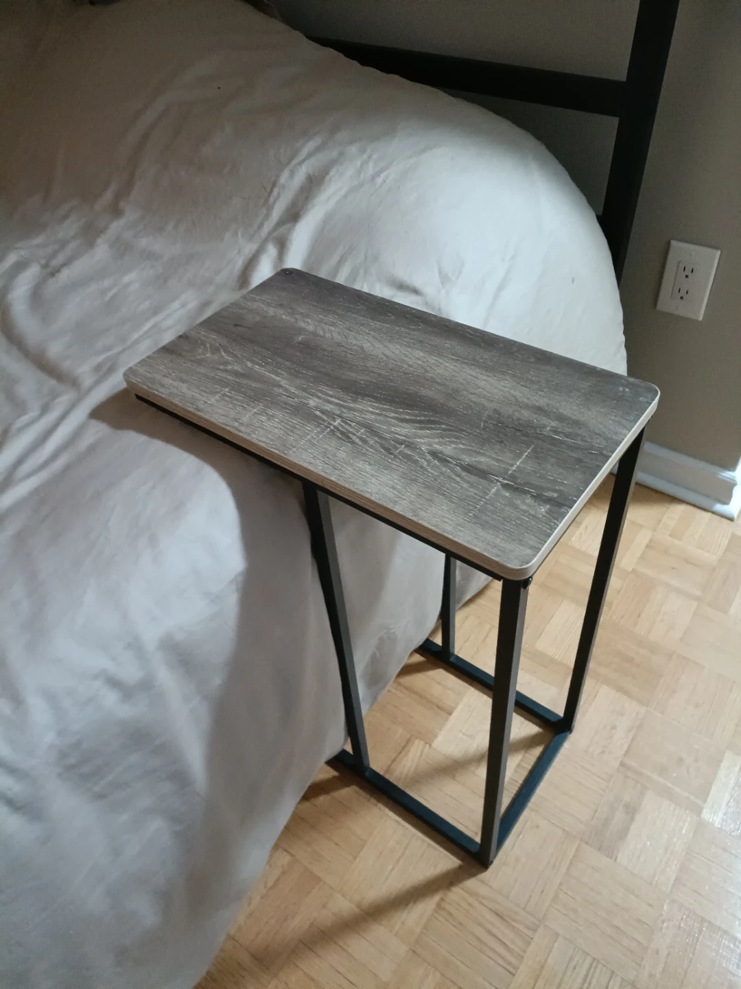 Selling a handy side table with a sturdy metal frame. It's perfect for placing next to a bed or sofa. The top has a nice wood-grain finish, and it's in good condition!