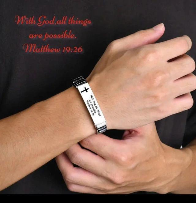 This stainless steel bracelet is a subtle statement piece with an engraved cross and the uplifting message, "With God, all things are possible. Matthew 19:26." Is a brand new item and ready to wear A beautiful way to express your faith and love.