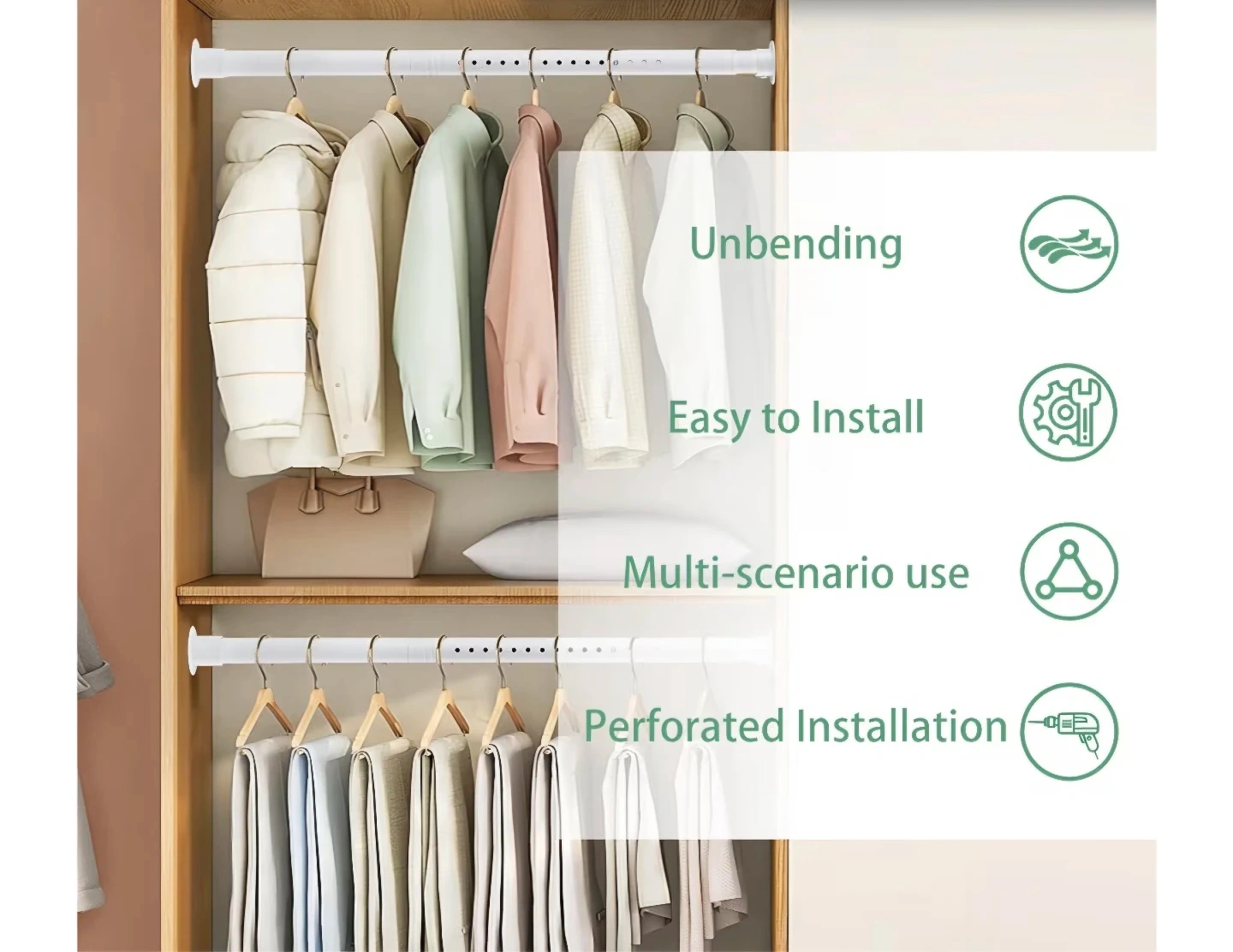 This adjustable closet rod is perfect for adding extra hanging space to your closet, veranda, kitchen, or bedroom. Multipurpose, adjustable. New. Heavy Duty 17"-51", 1.3" Diameter.