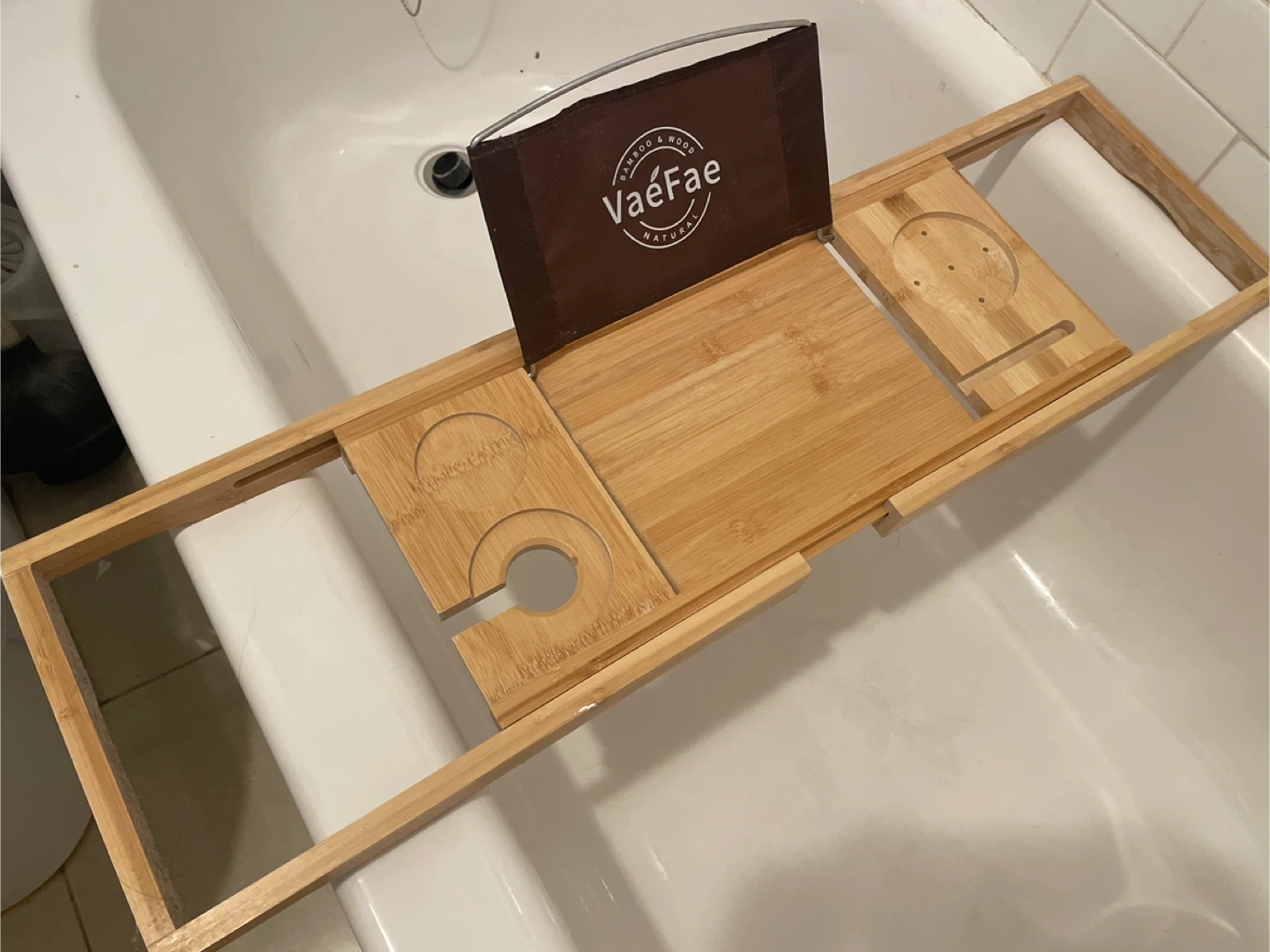 Selling a VaéFae bamboo bathtub caddy. It's in great condition and ready to bring some spa vibes to your bathroom! The caddy is made of natural bamboo and has a spot for your book, phone, and even a glass of wine or a cup of tea