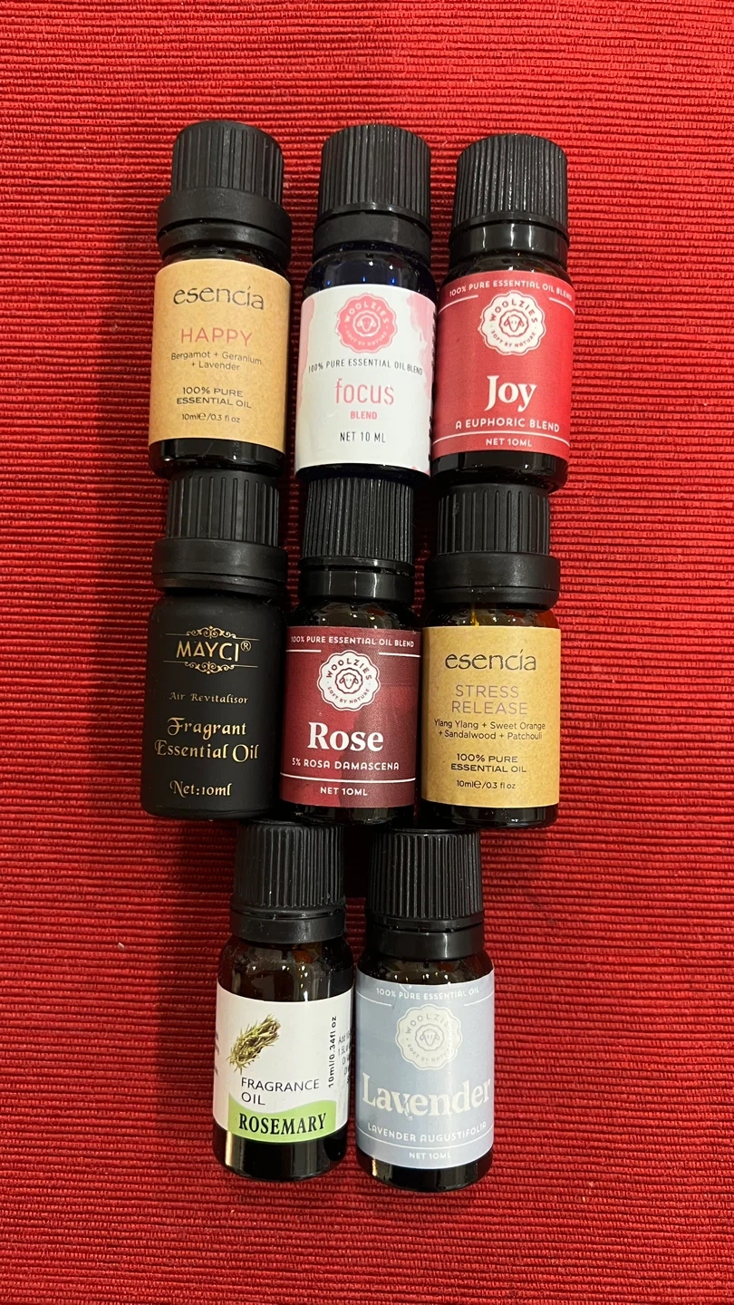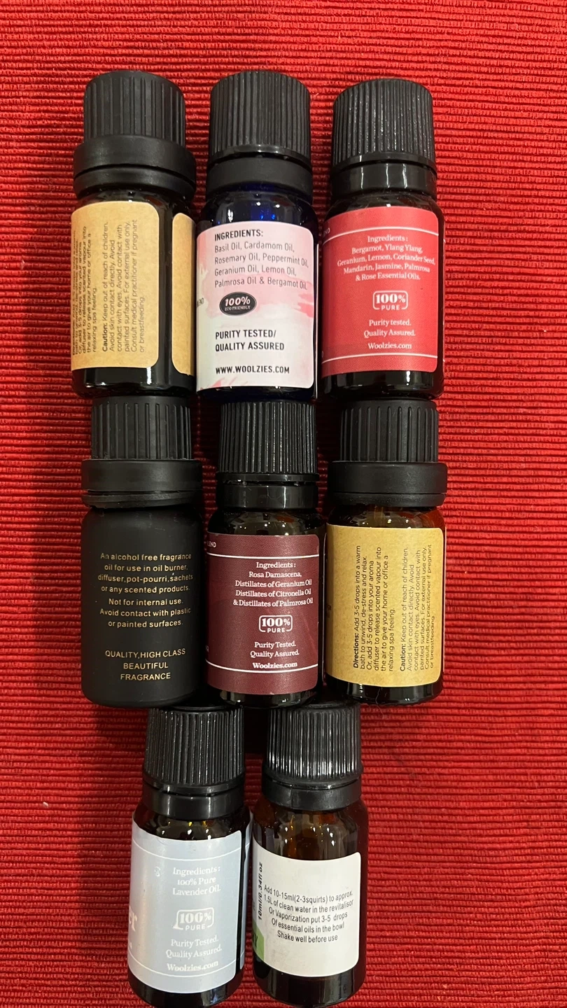 I'm selling a collection of 8 essential oils from Woolzies and Esencia. Each bottle has been tried but is more than 3/4 full.