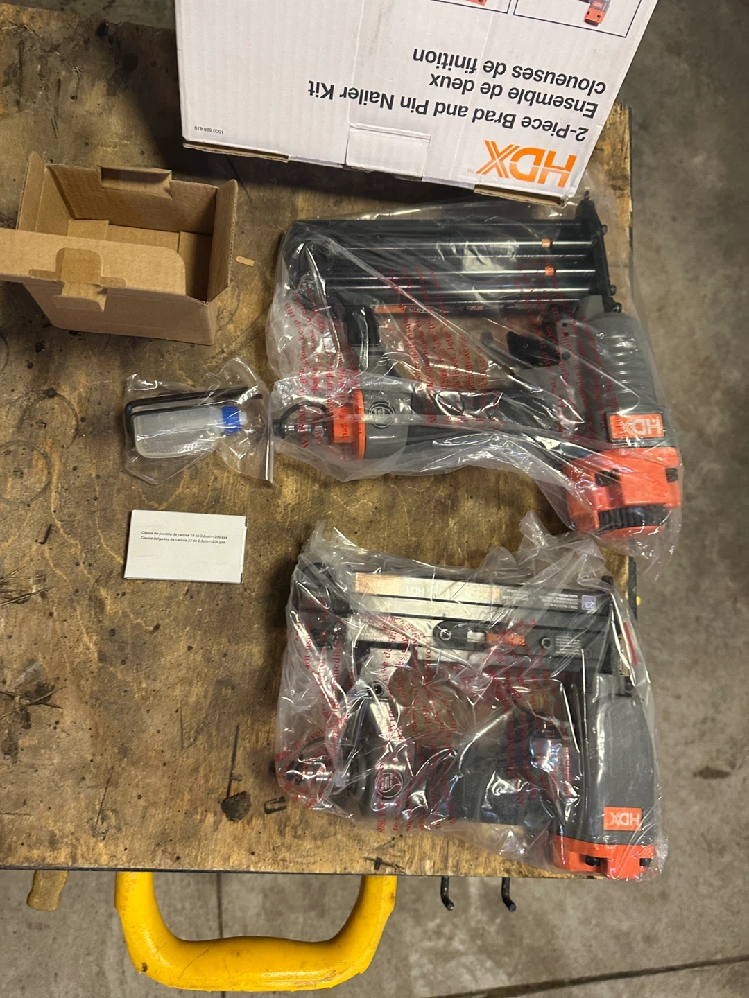 Selling a HDX 2-Piece Brad and Pin Nailer Kit. Includes (1) Brad Nailer, (1) Pin Nailer and Accessories. Comes with a dual-spring magazine and includes 200 fasteners for each gun. Also features an automatic reload indicator and a 360° adjustable exhaust. Box included