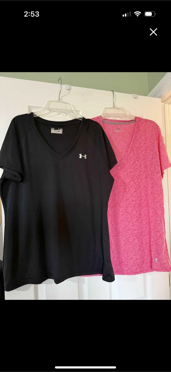 Two Under Armour t-shirts up for grabs! One is black and the other is pink. Both are size large and in great condition. Perfect for workouts or casual wear!