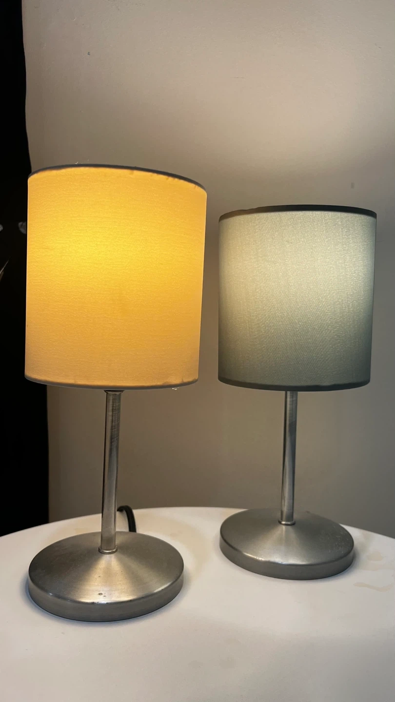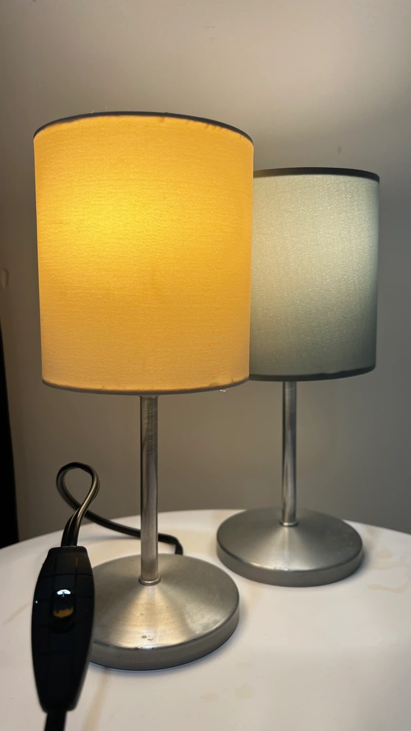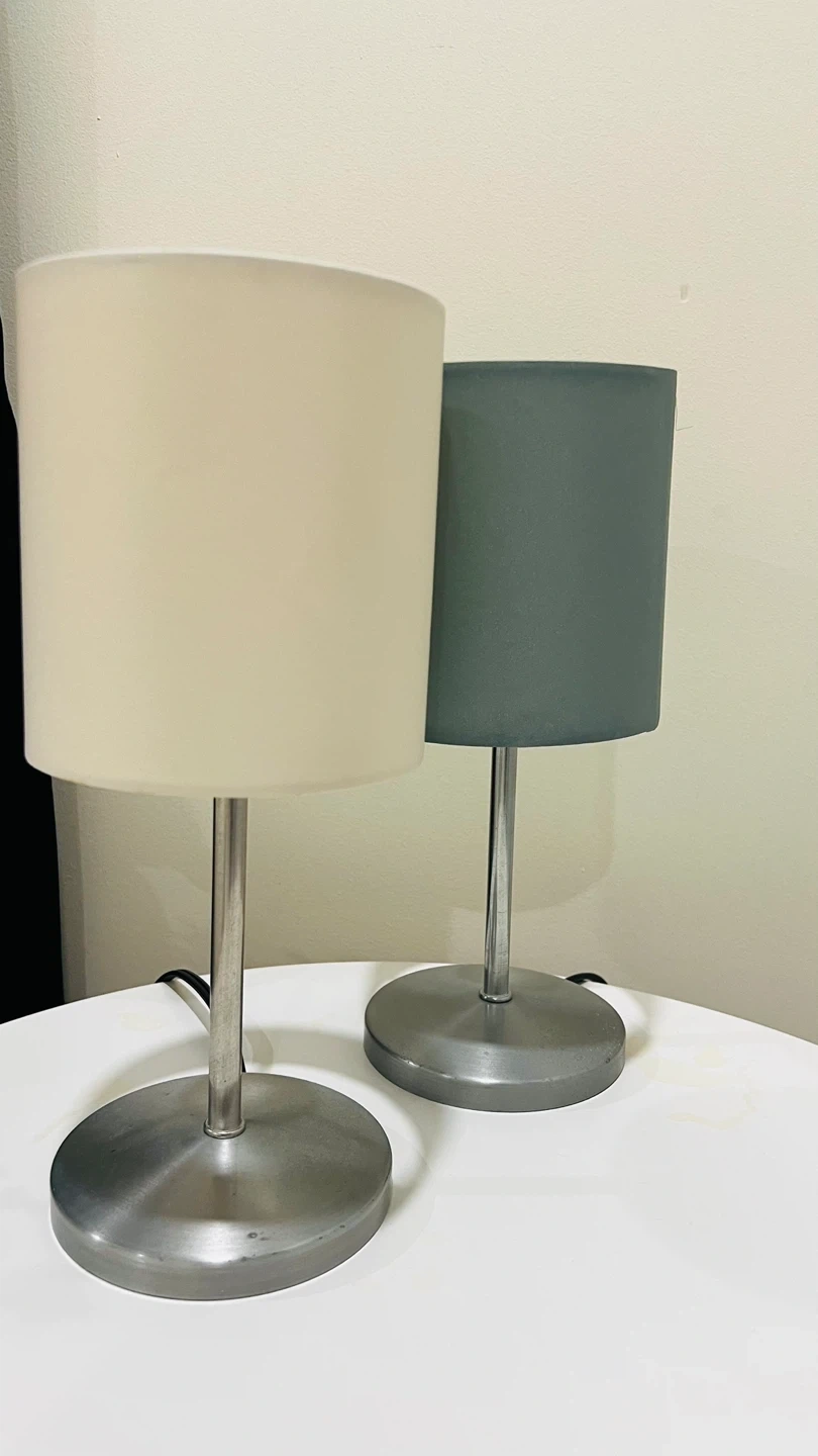 Selling a set of two table lamps. One has a cream-colored shade, and the other has a greys-green shade. They would look great in any room.