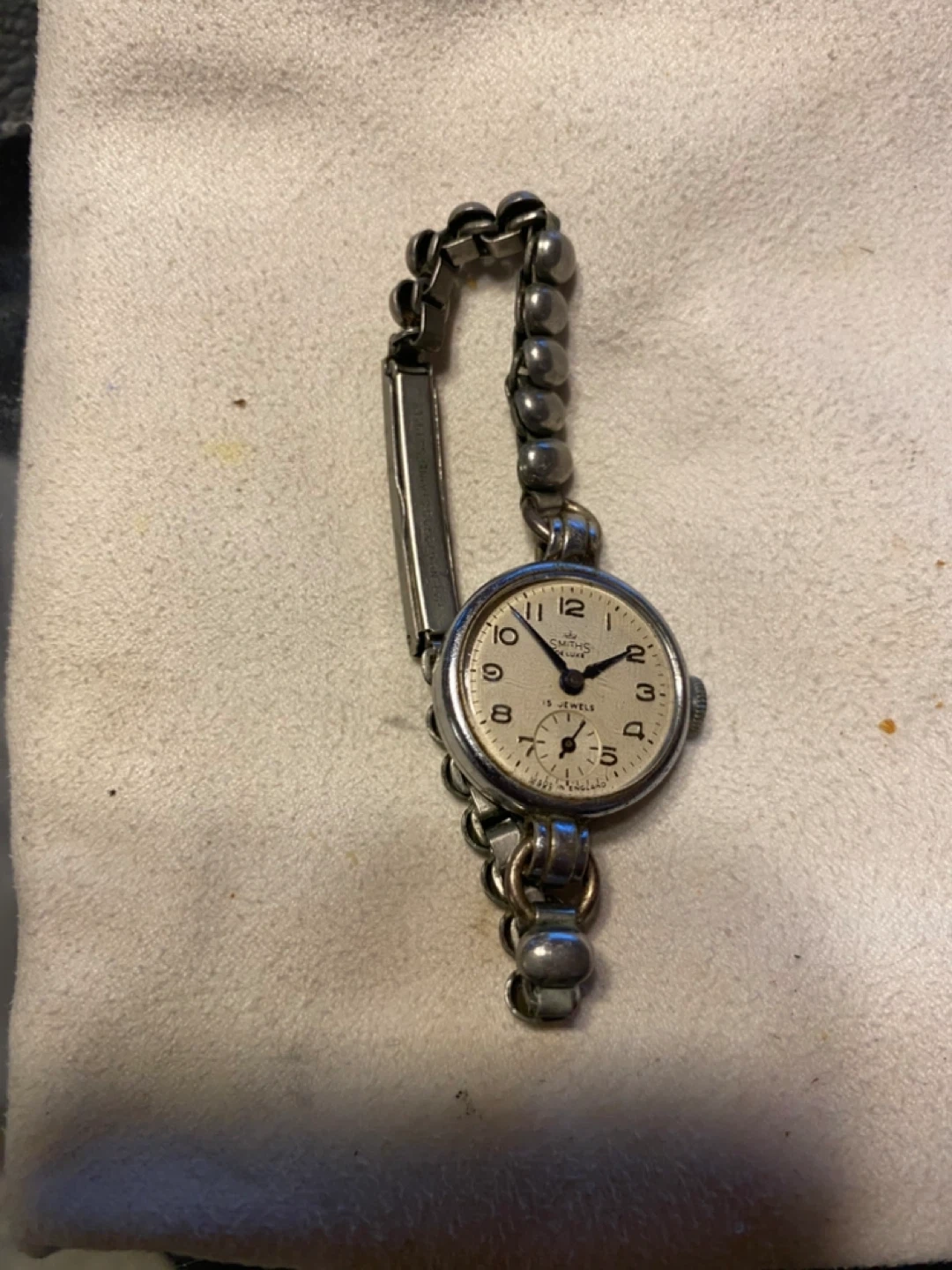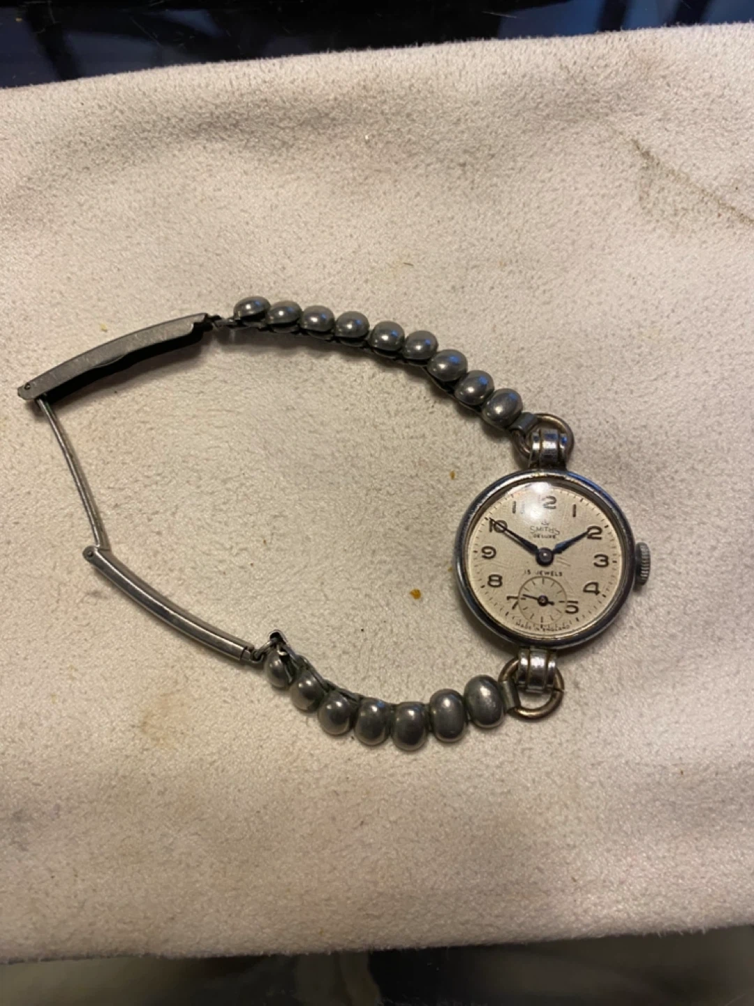 Selling a working vintage Smiths Deluxe watch! It features 15 jewels and a unique beaded bracelet. I believe the band is original. Watch is 22mm. Made in England.