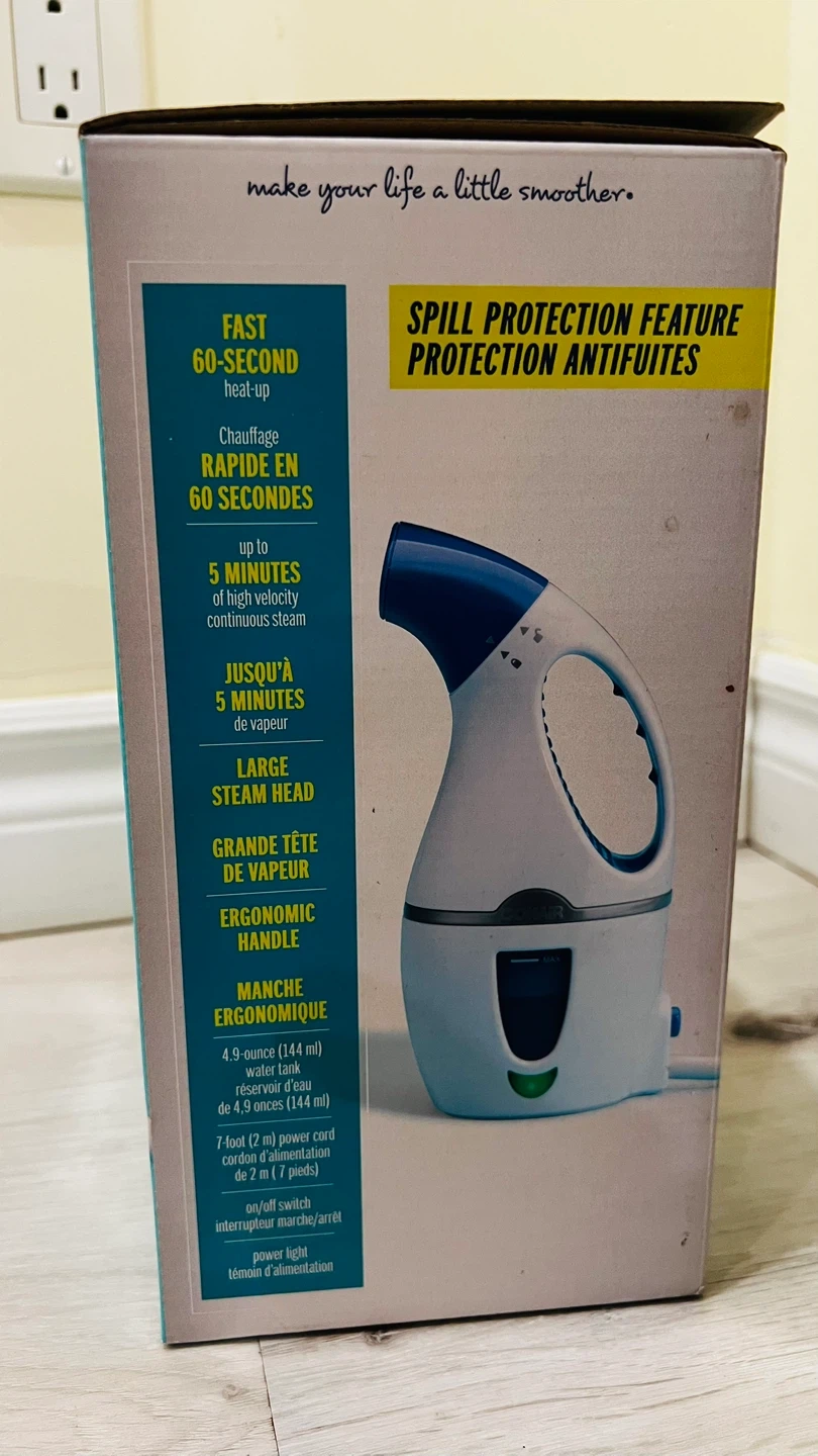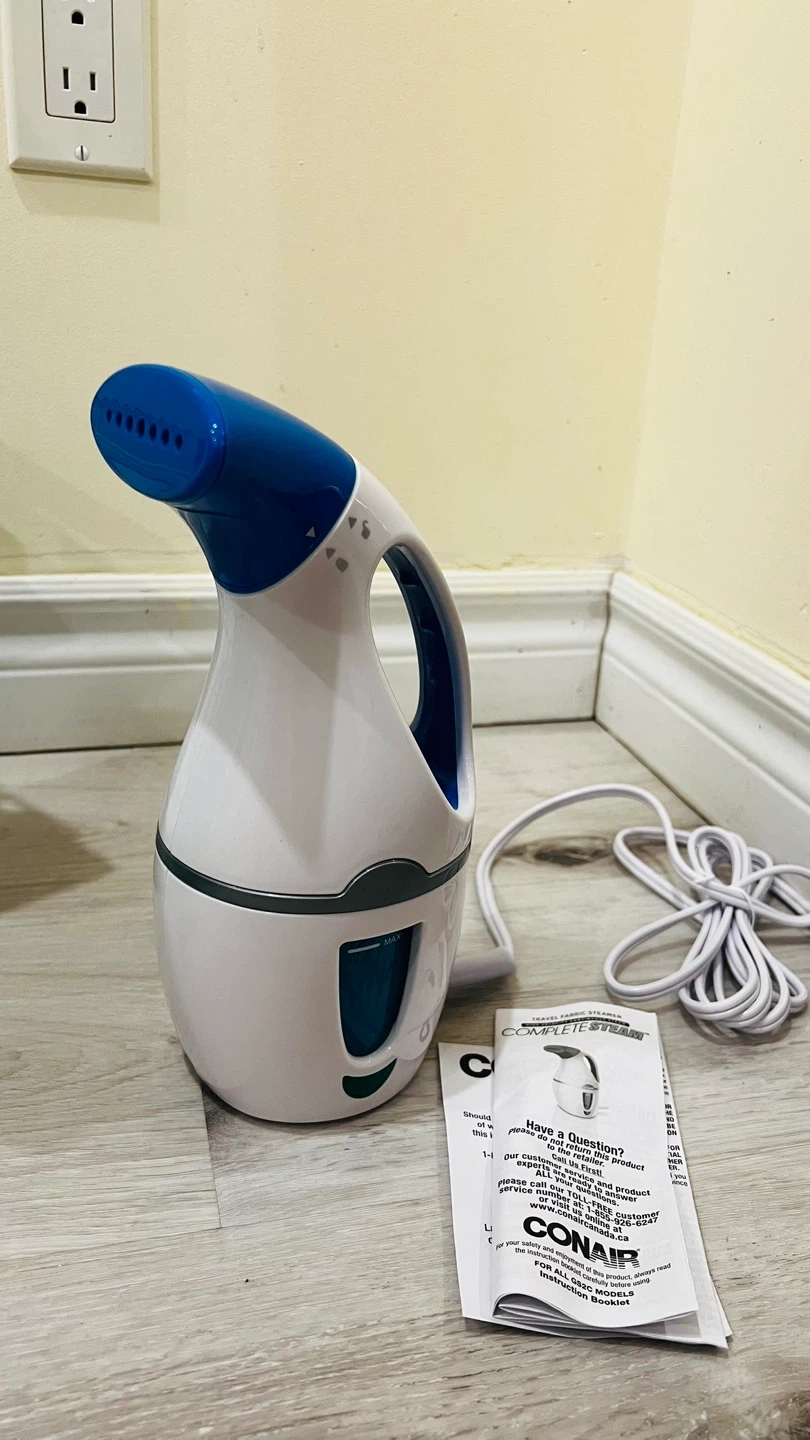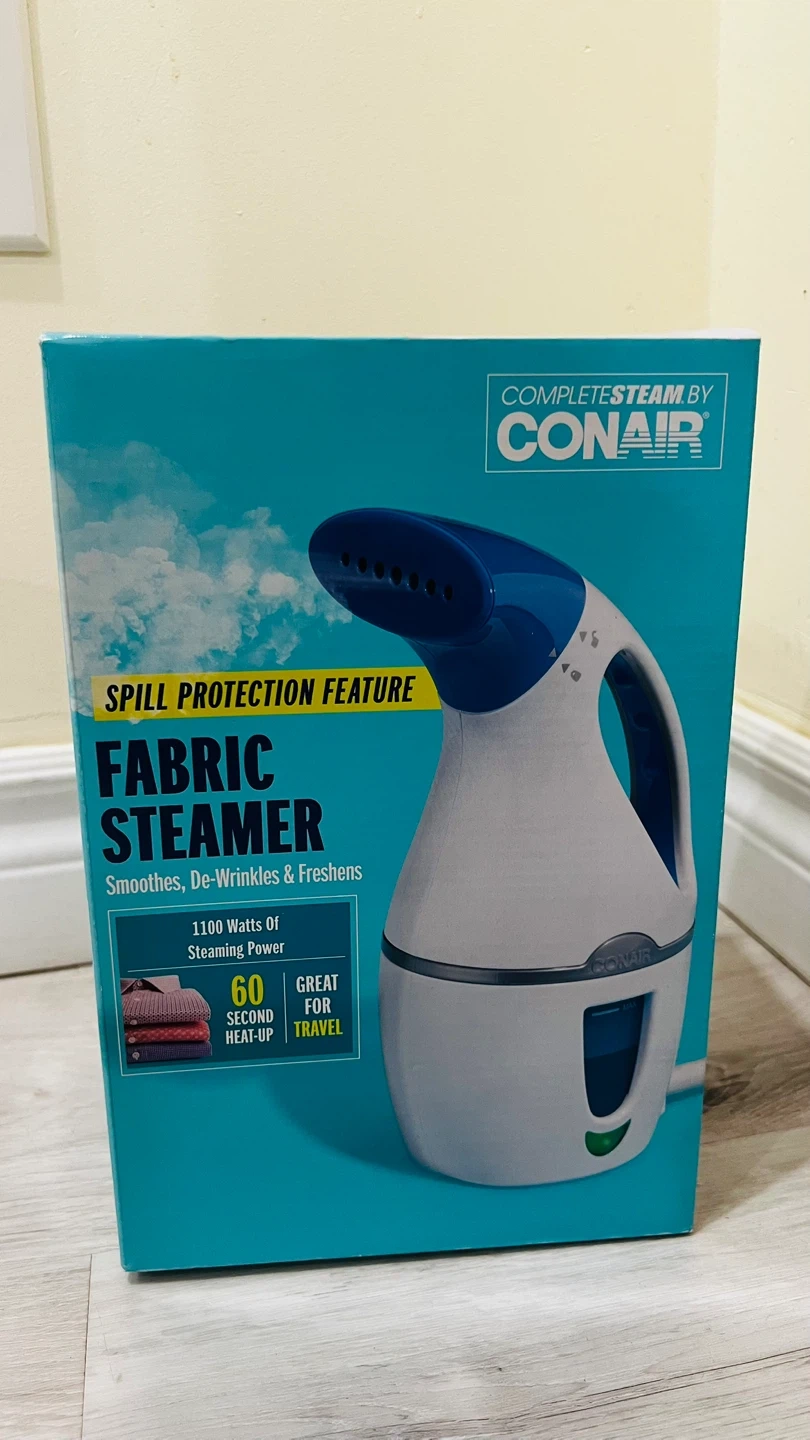 Selling a Conair Complete Steam Fabric Steamer. It's in new condition and comes with the original box! This steamer has a spill protection feature and heats up in just 60 seconds. It features a 4.9-ounce water tank and a 7-foot power cord.