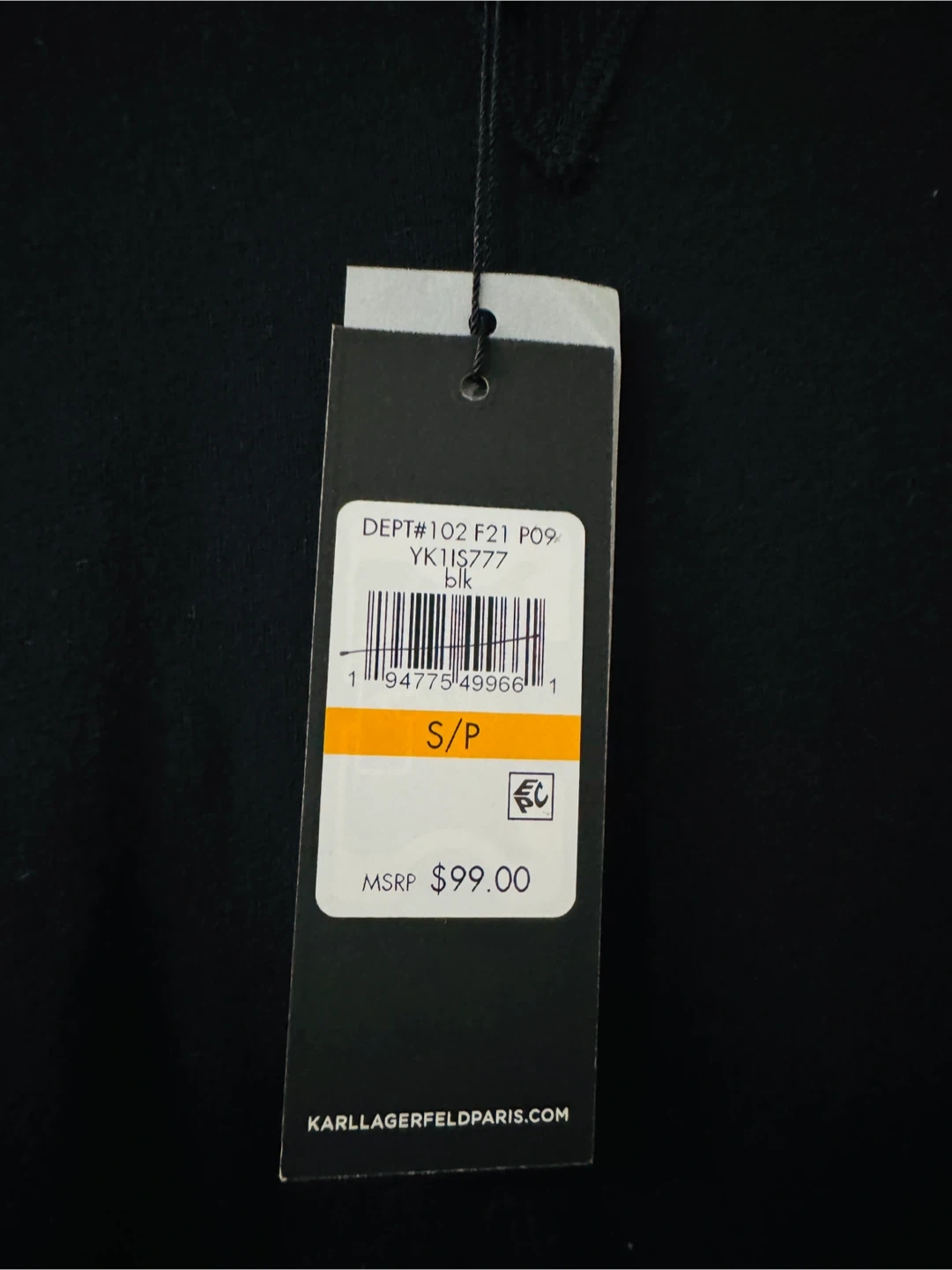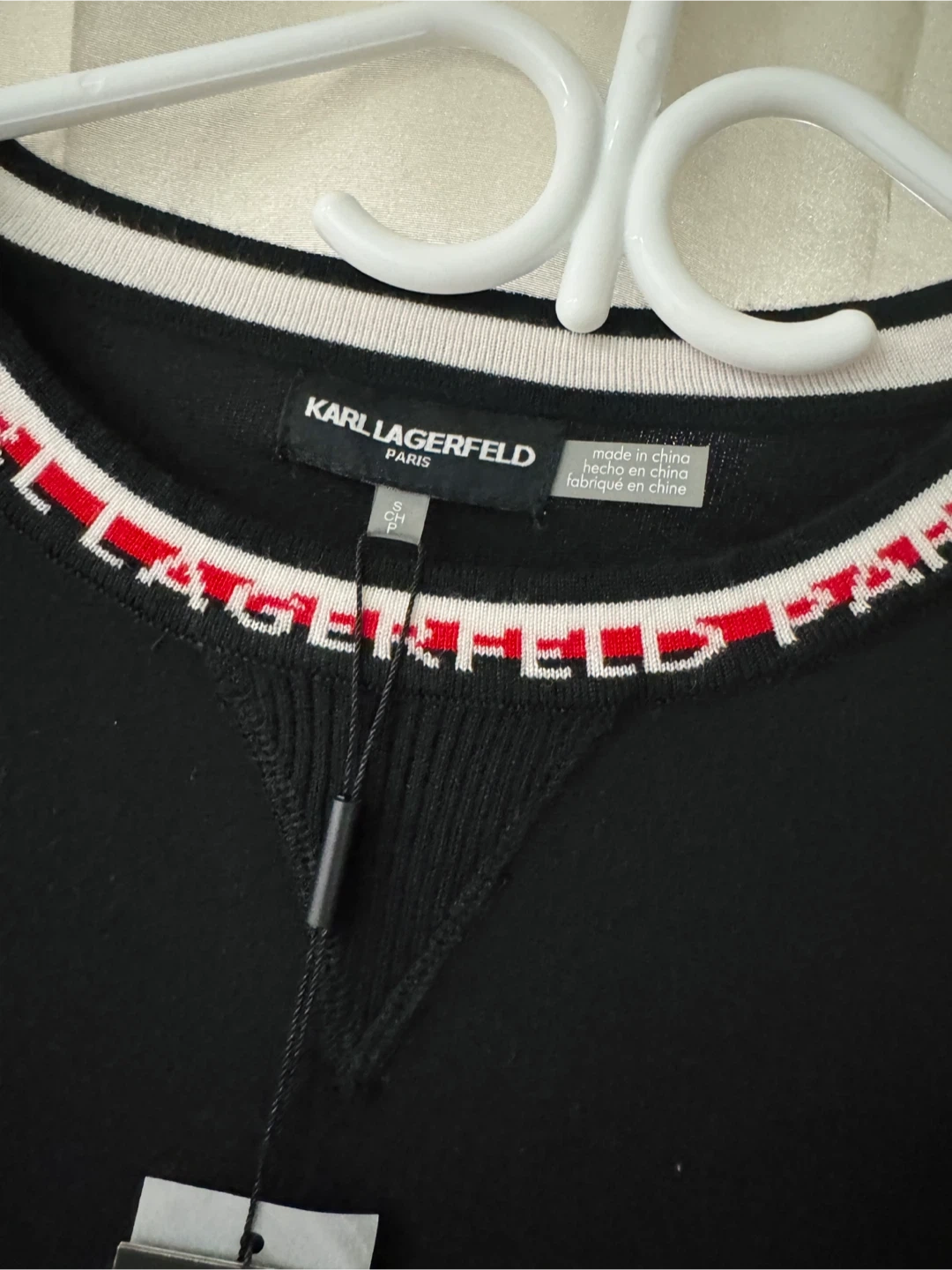 This Karl Lagerfeld Paris sweater is a stylish addition to any wardrobe! It's black with a distinctive logo design around the neckline. The size is small. Originally priced at $99.00, it's a great deal for a designer piece!