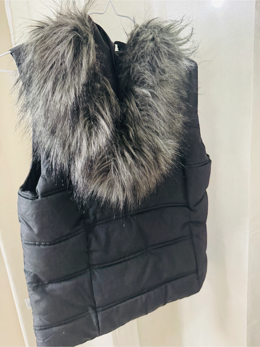 Here's a stylish black padded vest from ONLY! It features a faux fur hood for extra warmth and a unique toggle closure. It's in great condition and perfect for layering during those cooler days