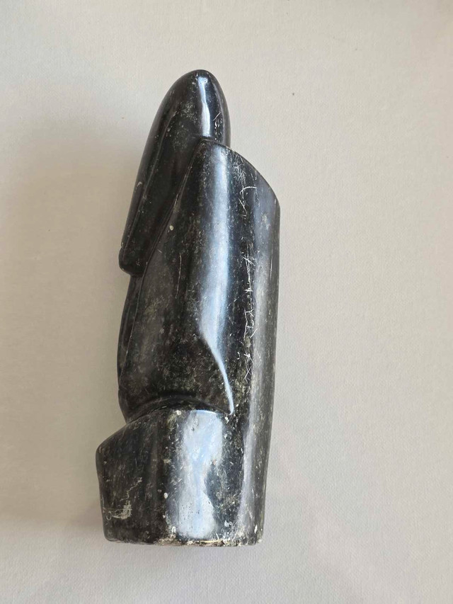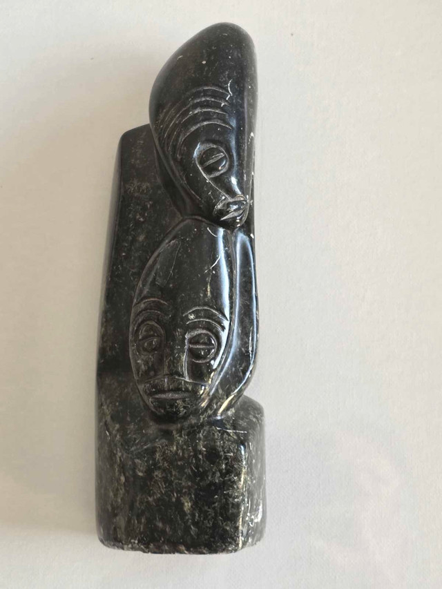 This striking Inuit carving features a compelling double-faced design, meticulously crafted from stone. The piece bears the signature of the artist, adding to its value and authenticity. As a used item, it carries a unique character, perfect for enriching any collection with a touch of Indigenous art. Carving measures approximately 9 inches tall.