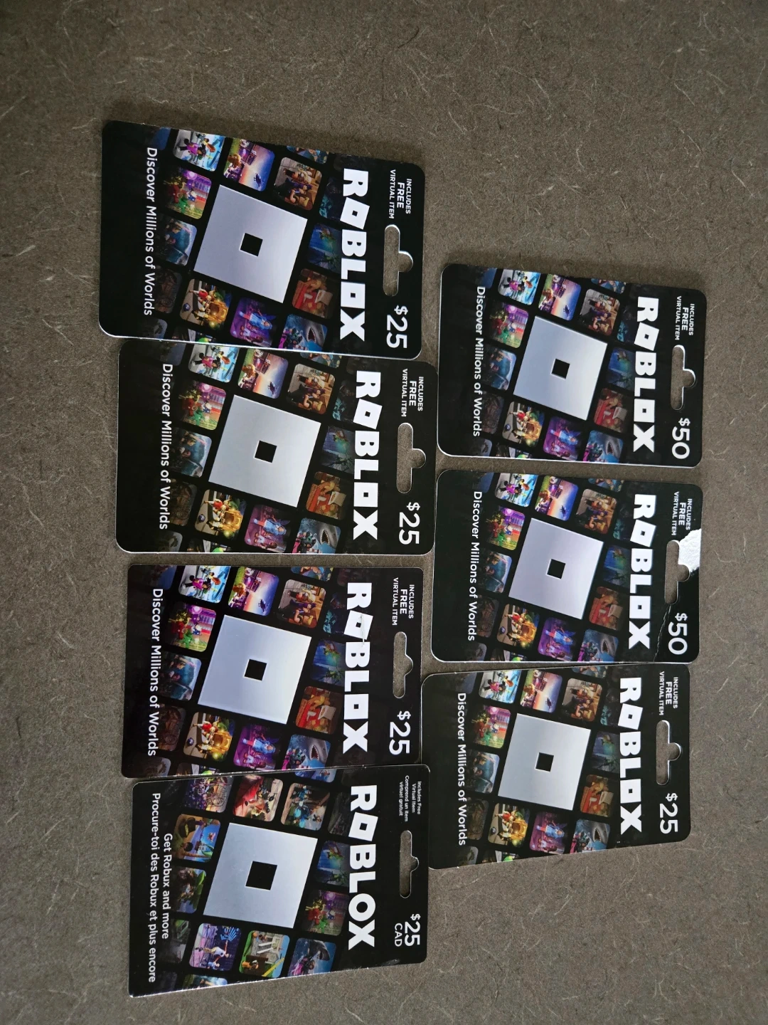 I have a collection of Roblox gift cards available. There are a few $25 cards and a couple of $50 cards. They're perfect for anyone who enjoys playing Roblox and wants to get some Robux!