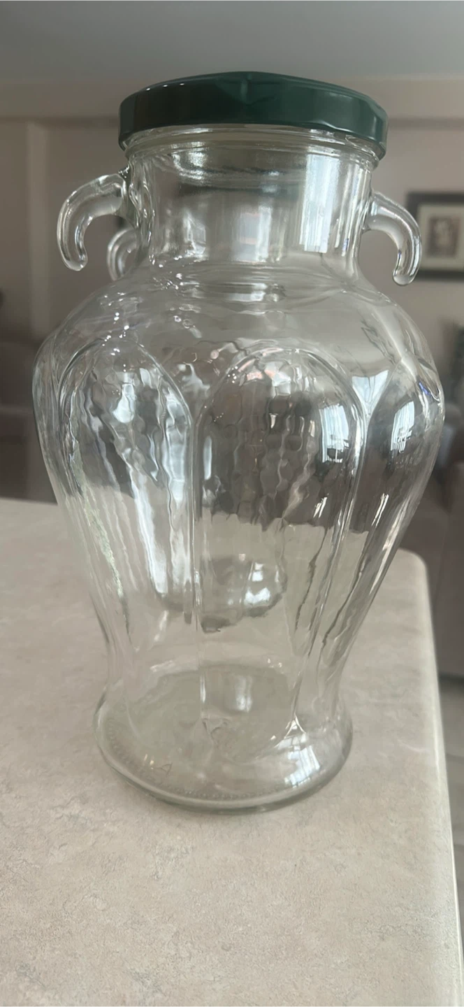 Selling a vintage glass jar with a green lid. It's in good condition and ready for a new home!