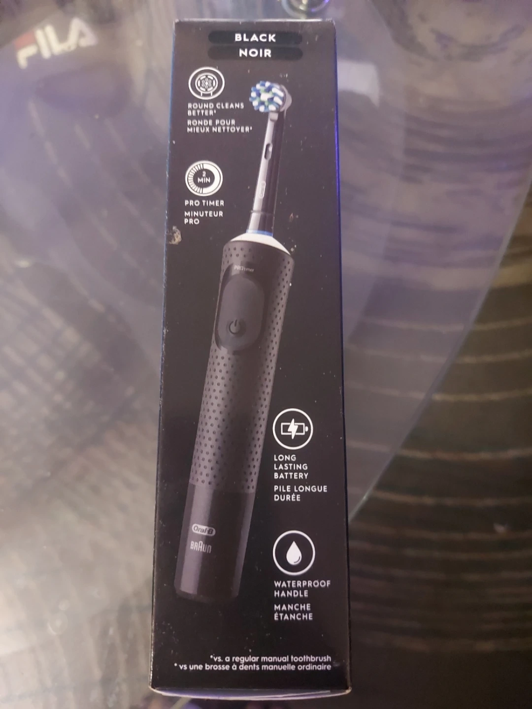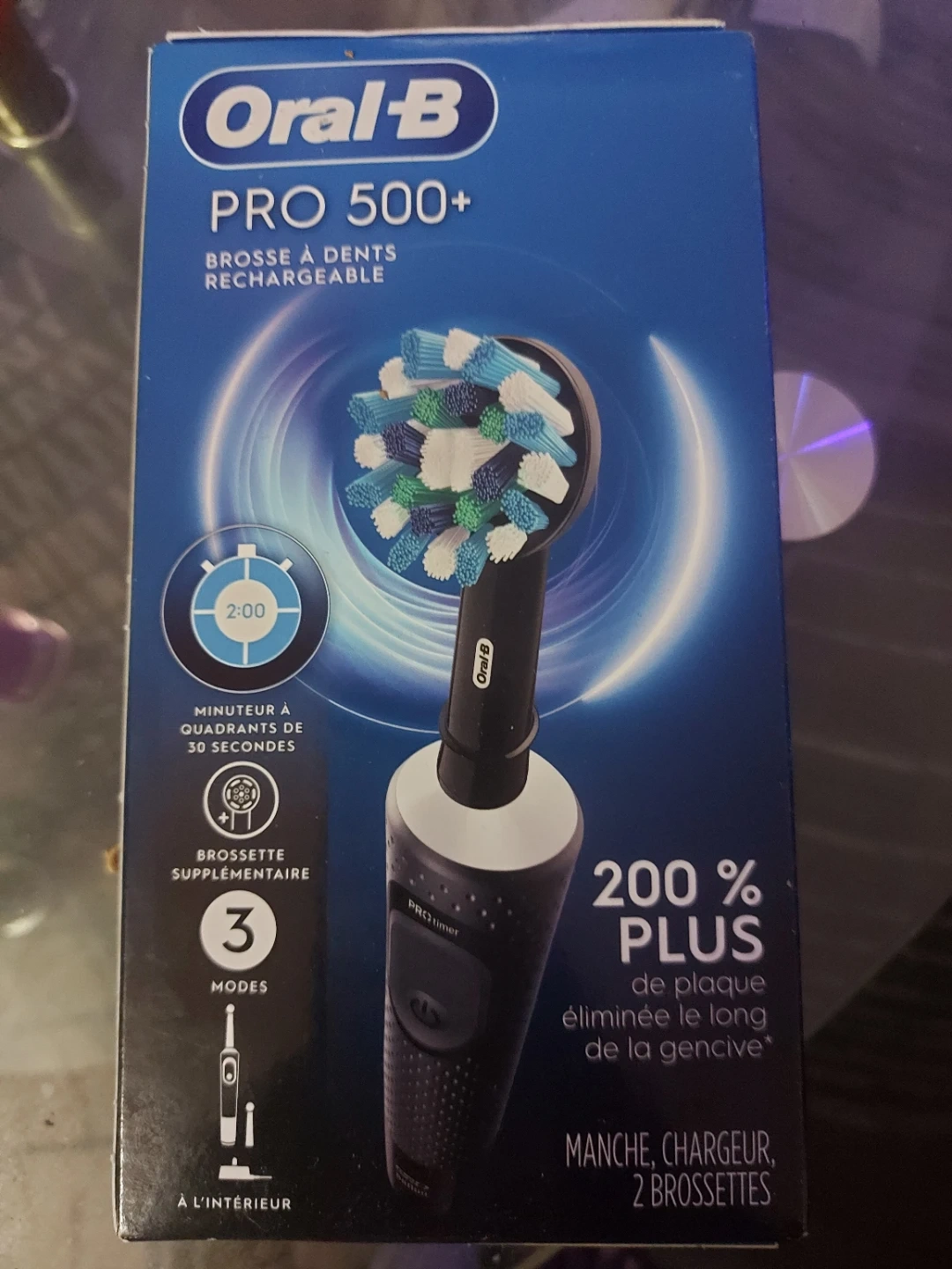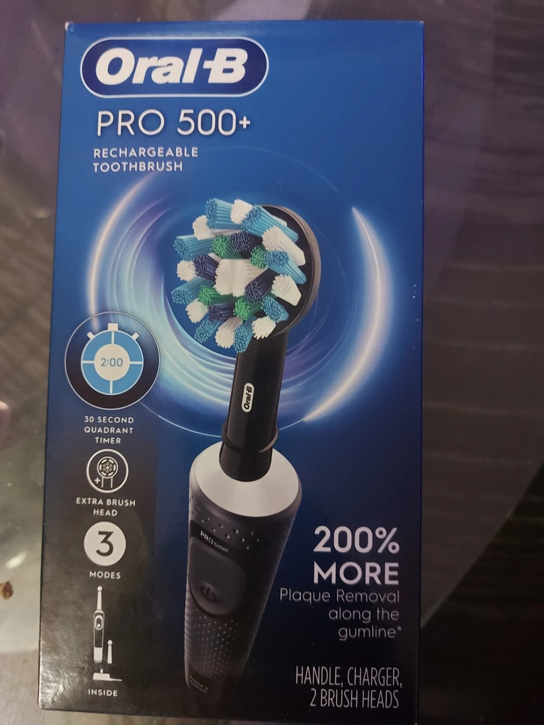 221Selling an Oral-B PRO 500+ rechargeable toothbrush in black! It comes with the handle, charger, and two brush heads, all inside the original box. This toothbrush offers 200% more plaque removal along the gumline compared to a regular manual toothbrush. It also features a pro timer and three cleaning modes for daily clean and sensitive cleaning modes