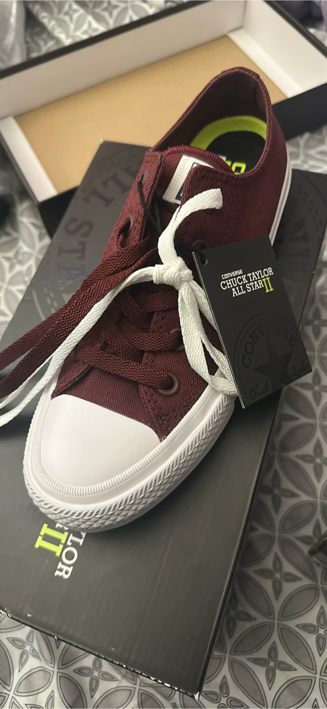 Selling a brand new pair of Converse Chuck Taylor All Star II sneakers! They are a stylish burgundy colour and come with the original box! They are a size 4 US men's, 6 US women's, 36.5 EUR, and 23 CM. Comes with the original box, tag still on, and a set of extra laces!