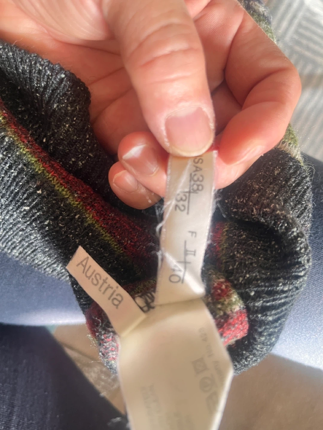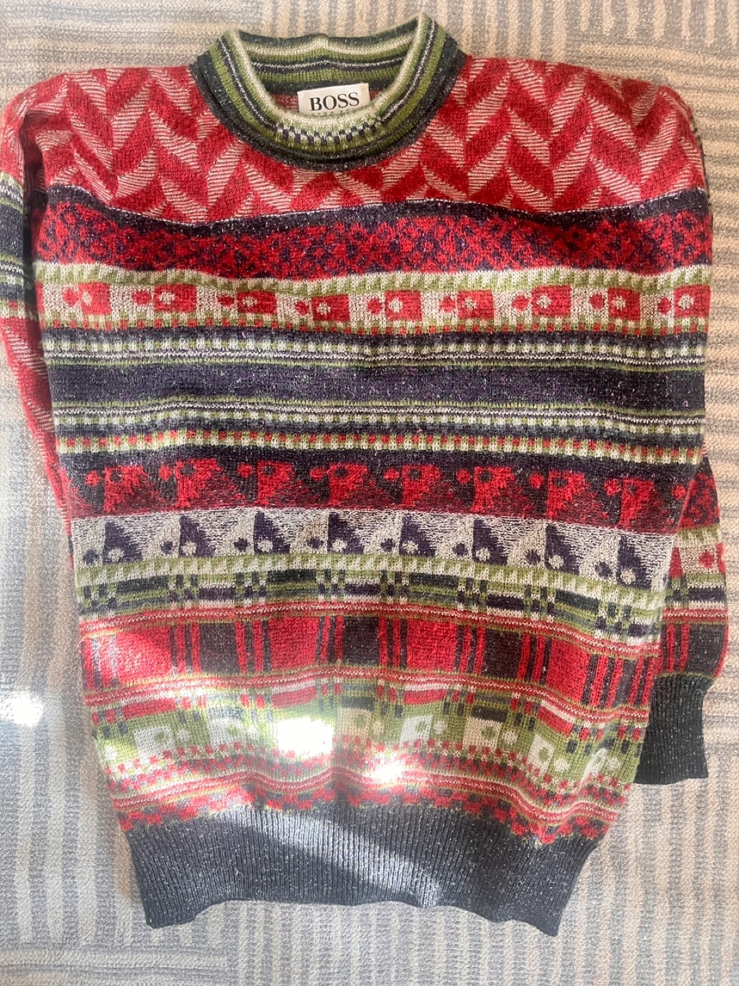 Selling a Hugo Boss sweater with a unique pattern. It's a size SA38. The sweater features a mix of red, green, and grey colours in a patterned design. Perfect for adding a bit of flair to your wardrobe!