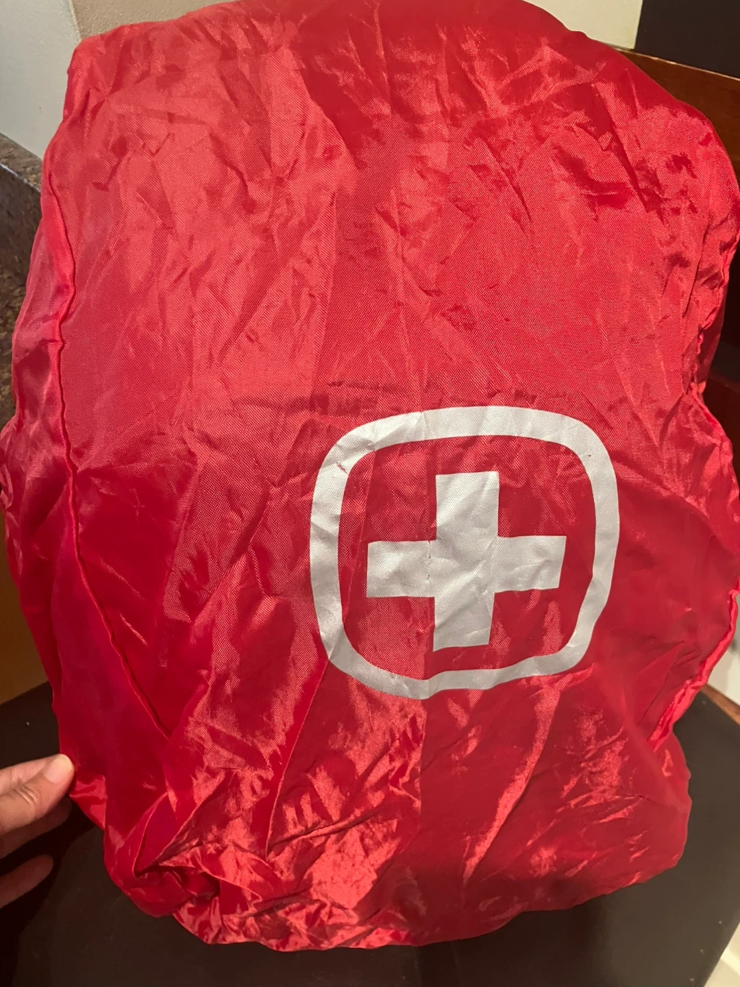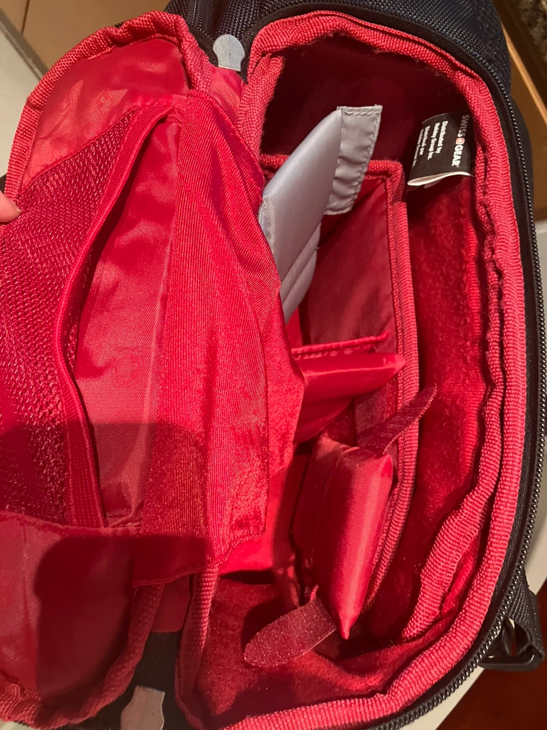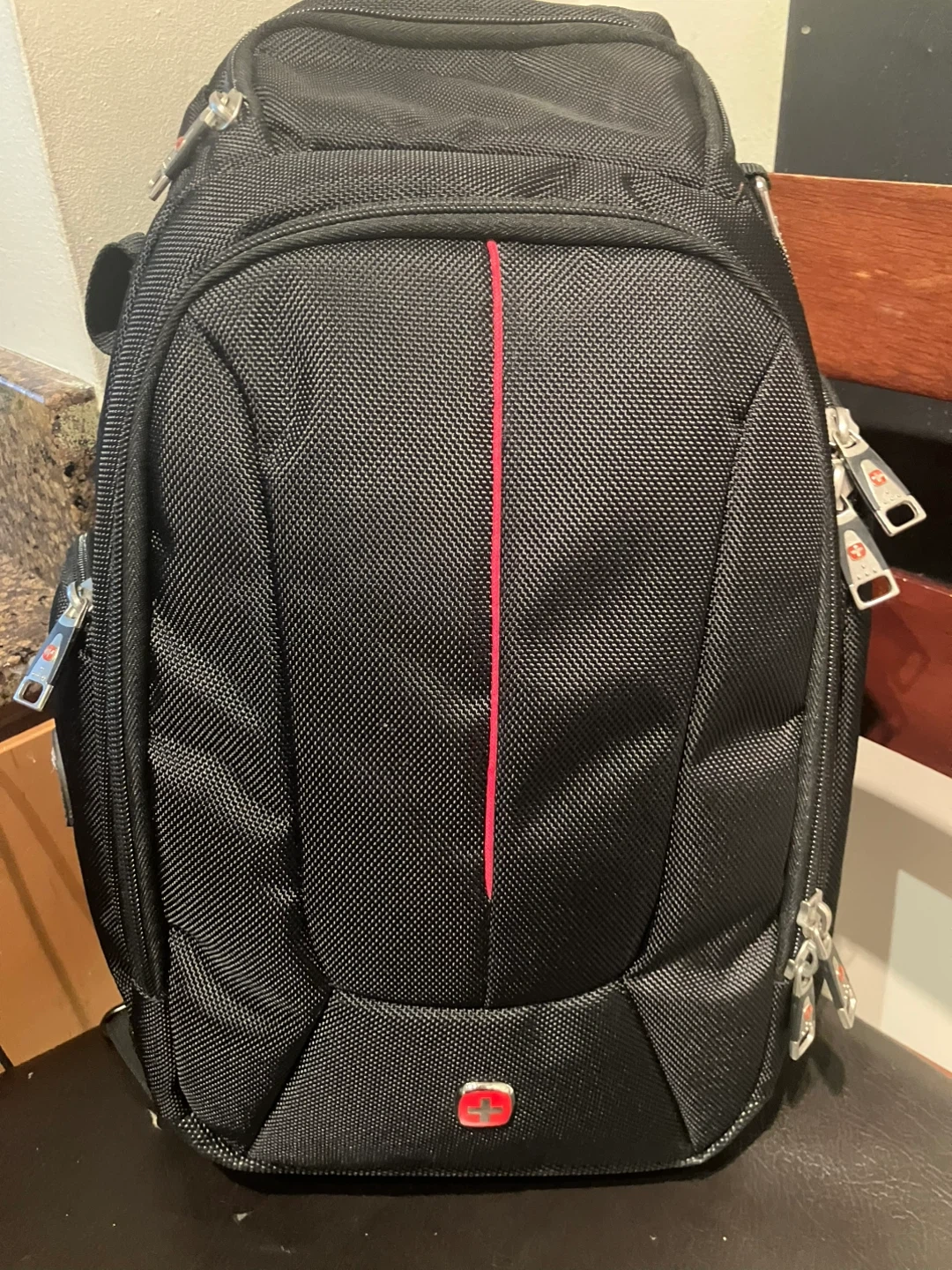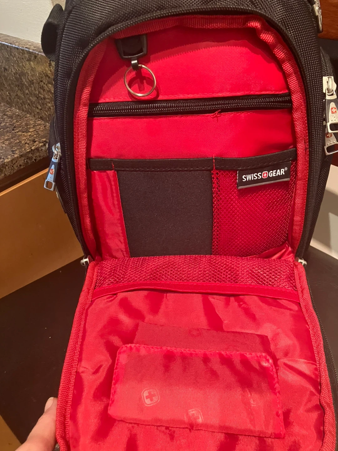 Selling a Swiss Gear backpack (cross body backpack) with rain cover included! It is in black with red accents. It's in great shape (like brand new) and ready for a new owner! Can hold a camera. The backpack features multiple compartments and a rain cover for added protection. Cross body function for ease and hands free. Also beautiful red interior with a rain covering included!
