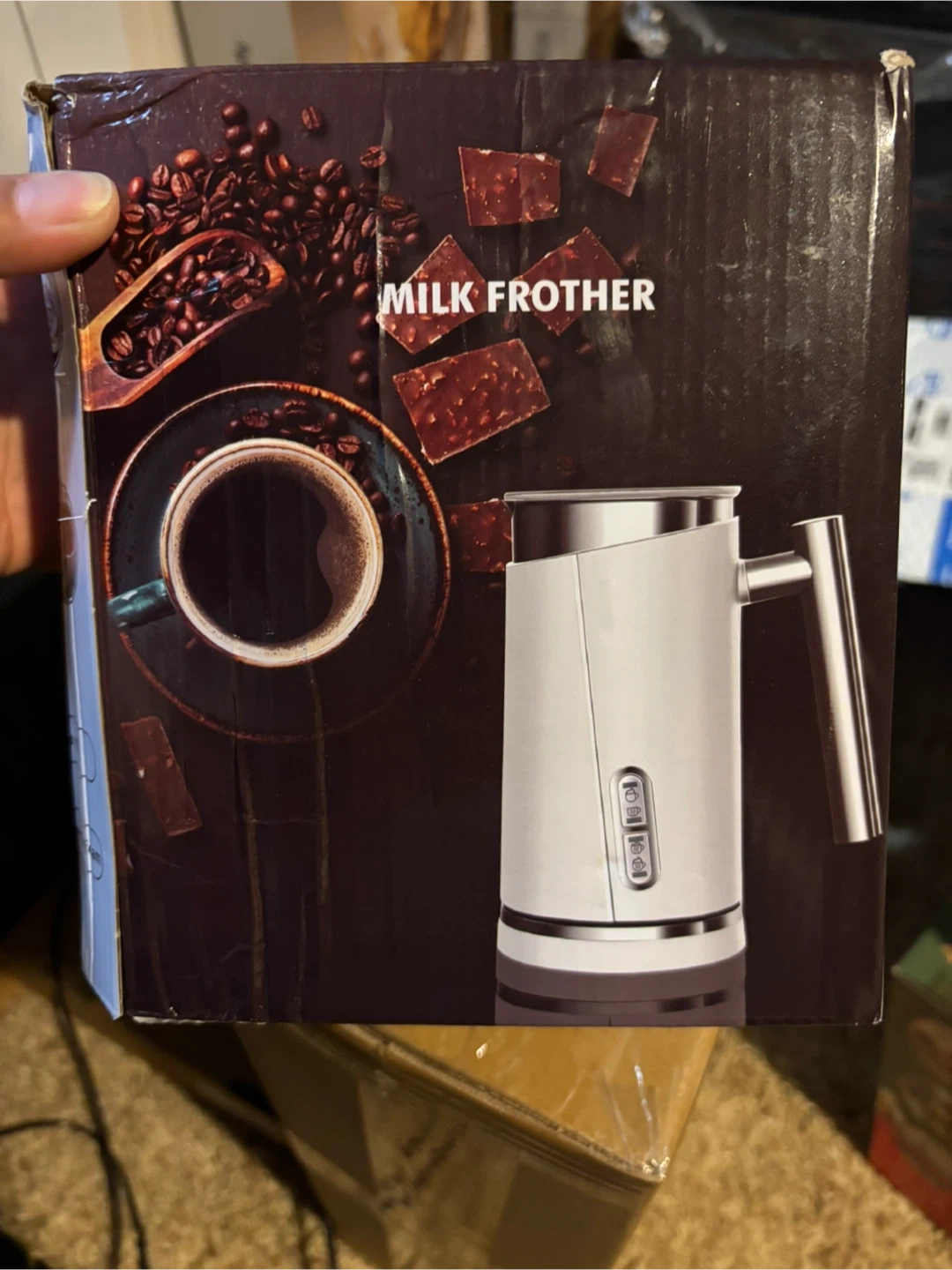 I'm selling a milk frother with a large capacity. It has a level scale to ensure you don't overfill it. - Max for heating milk: 10.14oz / 300ml - Max for frothing milk: 4.39oz / 130ml - Max for frothing milk: 3.38oz / 100ml The dimensions are: - 188mm / 7.45in tall - 110mm / 4.4in wide - 100mm / 3.9in deep The box is included!