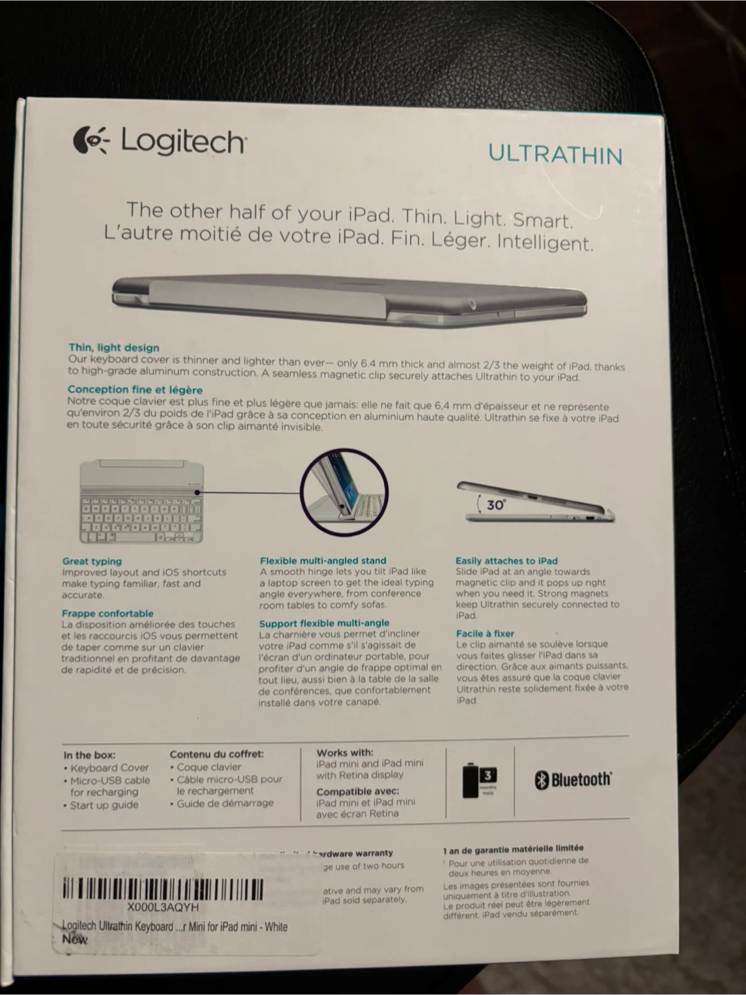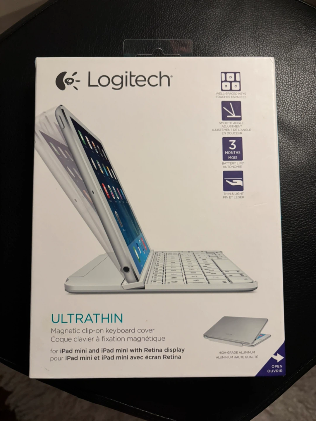 Selling a Logitech Ultrathin keyboard for iPad mini in white. It's in great condition and comes with the original box and a cable for recharging. This keyboard cover is thin and light, making it perfect for on-the-go use. It attaches magnetically to your iPad and has a flexible multi-angle stand for comfortable viewing