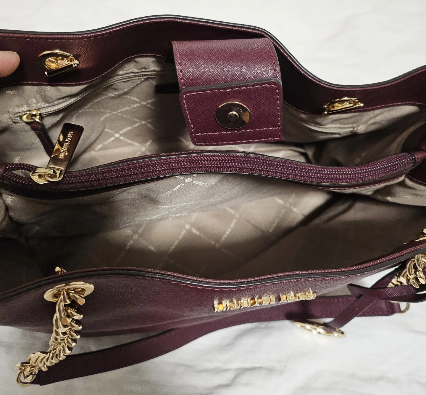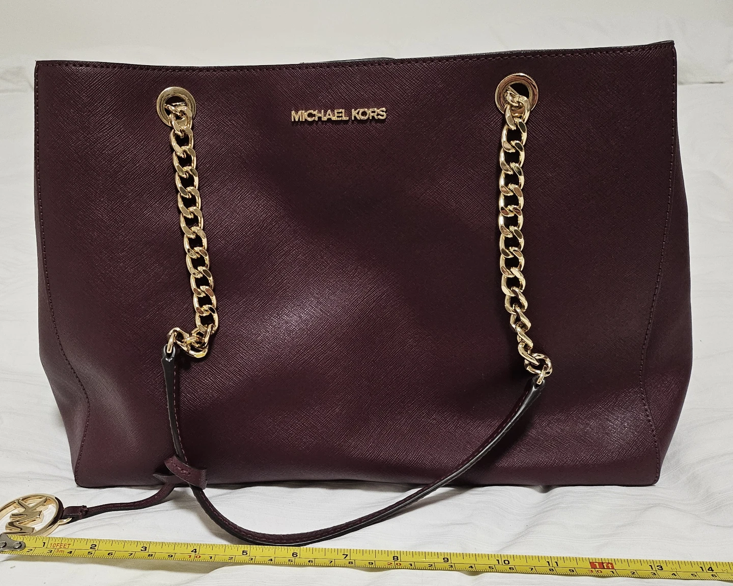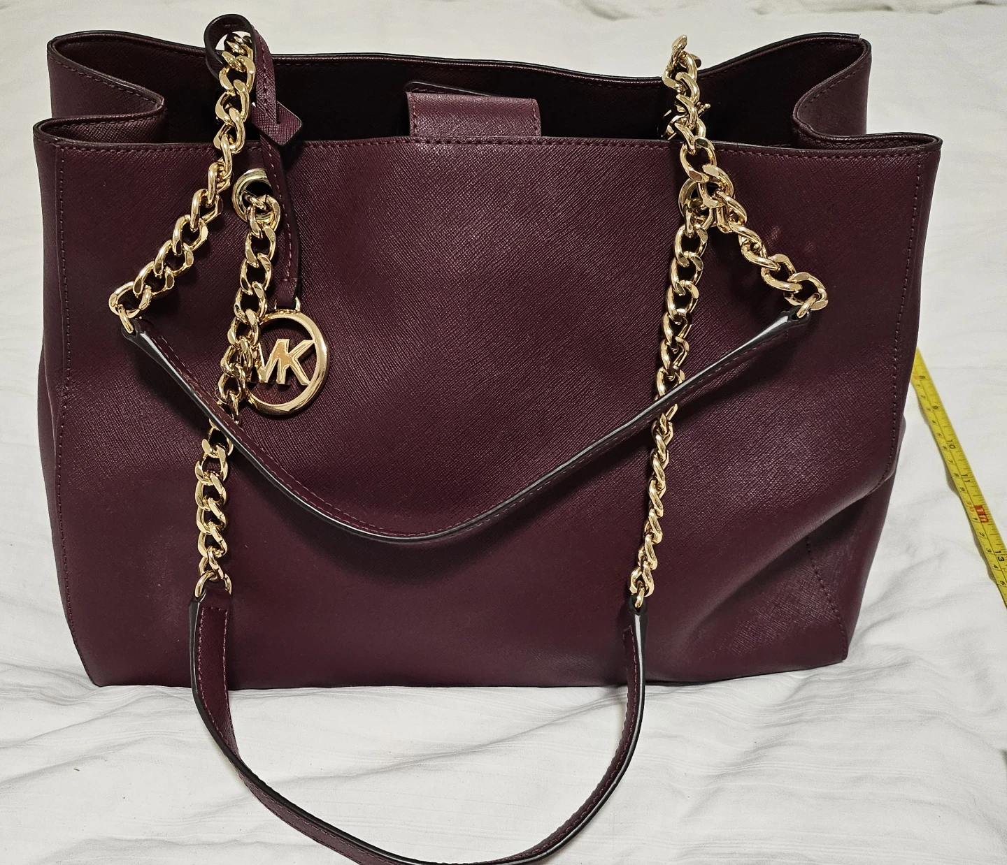 This is a Michael Kors tote bag in a beautiful burgundy colour. It has gold chain detailing and the MK logo charm. The interior is spacious with multiple compartments for organizing your essentials