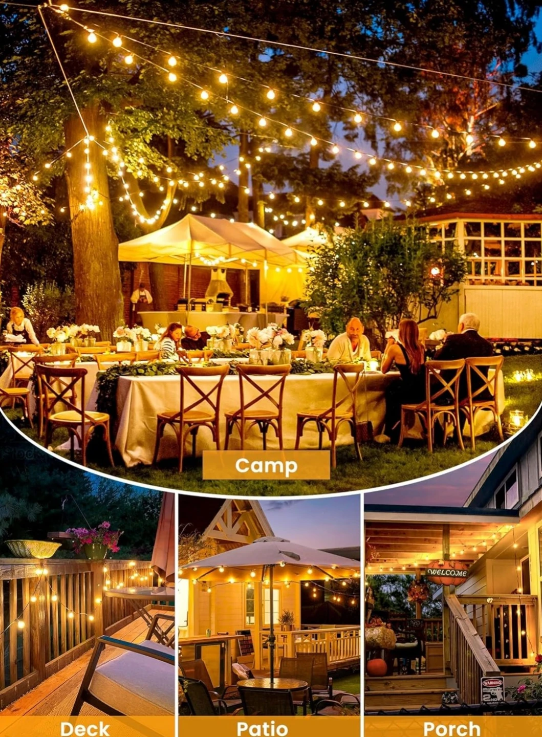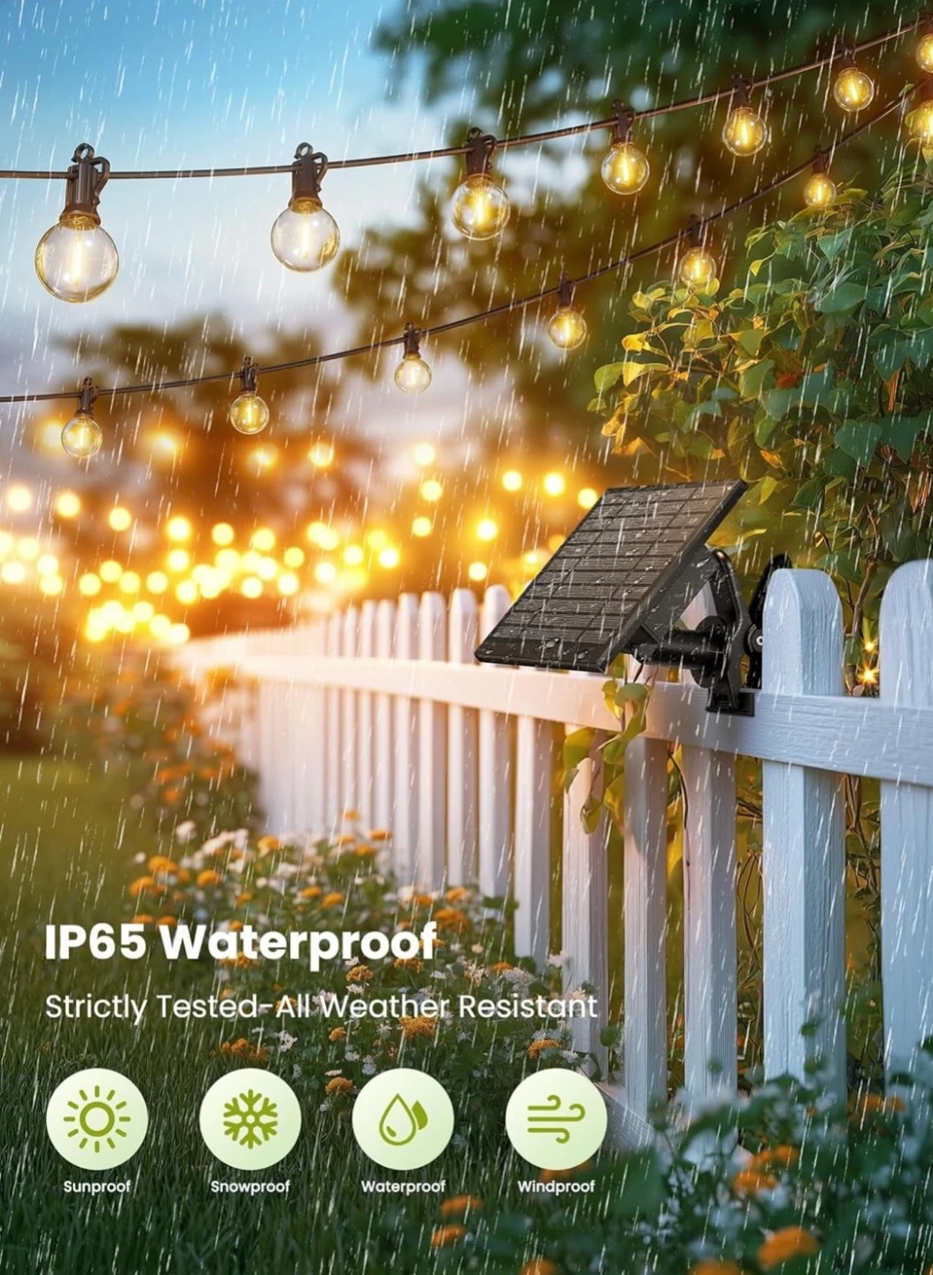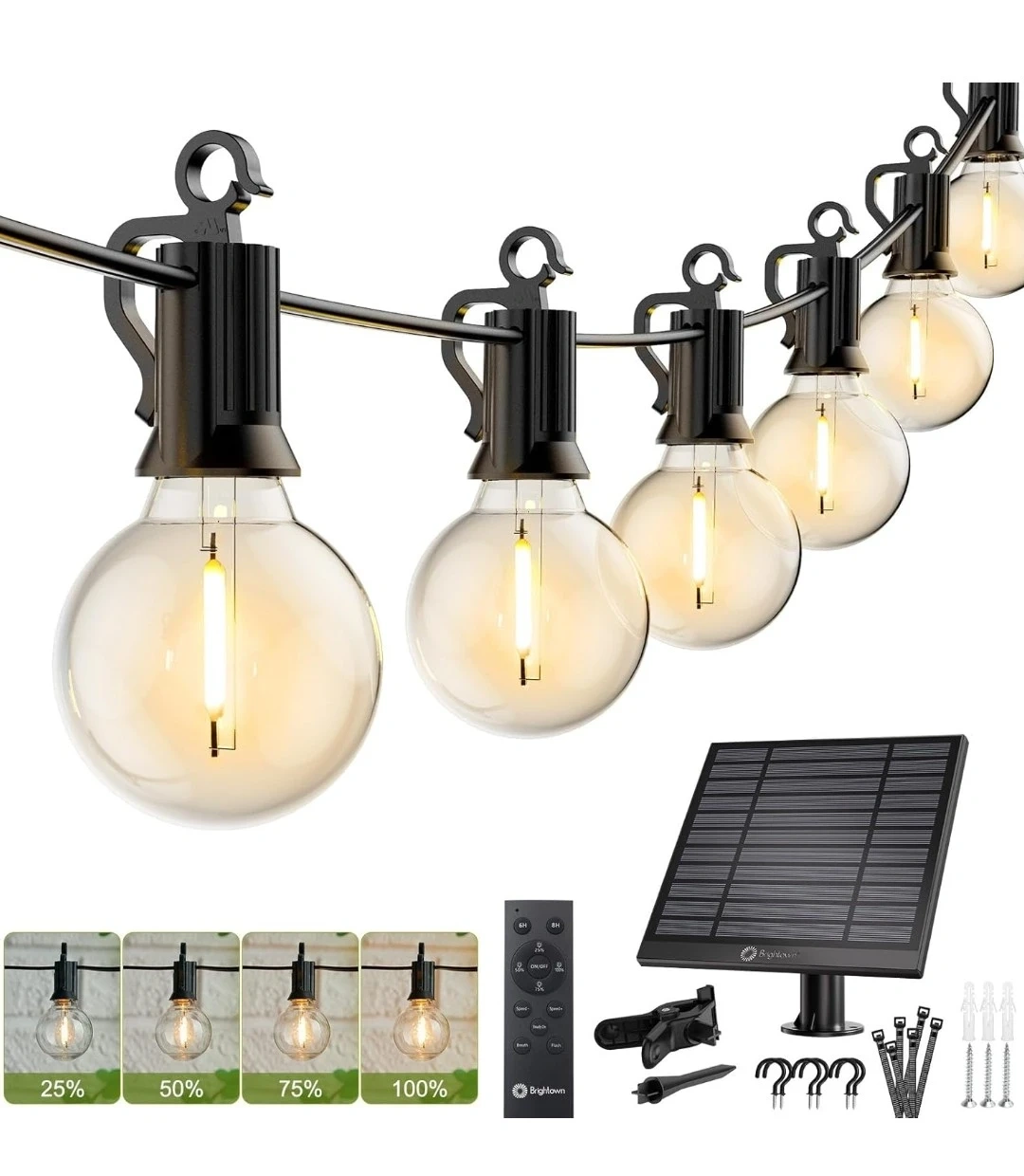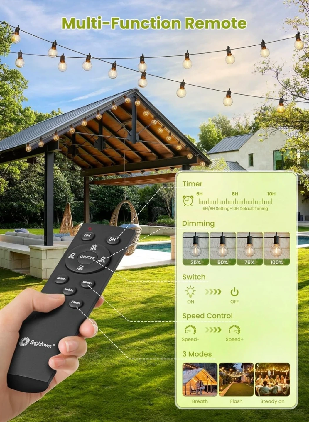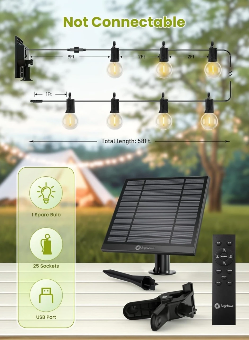 Brightown Solar String Lights Outdoor 58FT(48+10) with Remote Cable Ties and Hooks, G40 Patio Lights with 25 LED Shatterproof E12 Bulbs, 4 Light Modes, Dimmable Hanging Lights for Backyard Party Decor