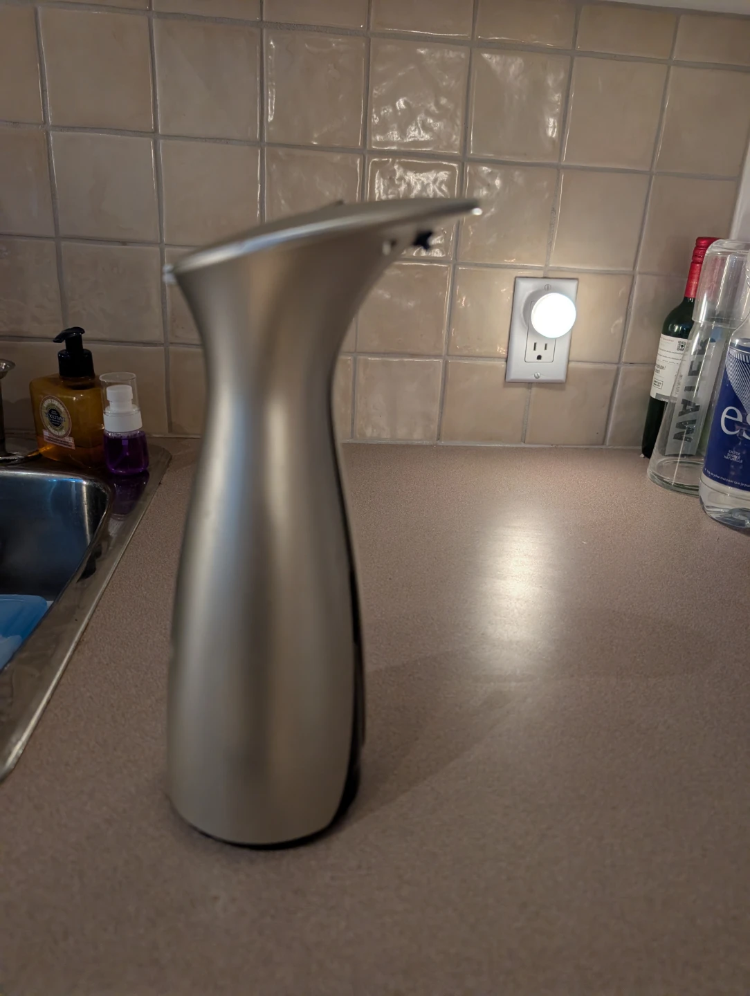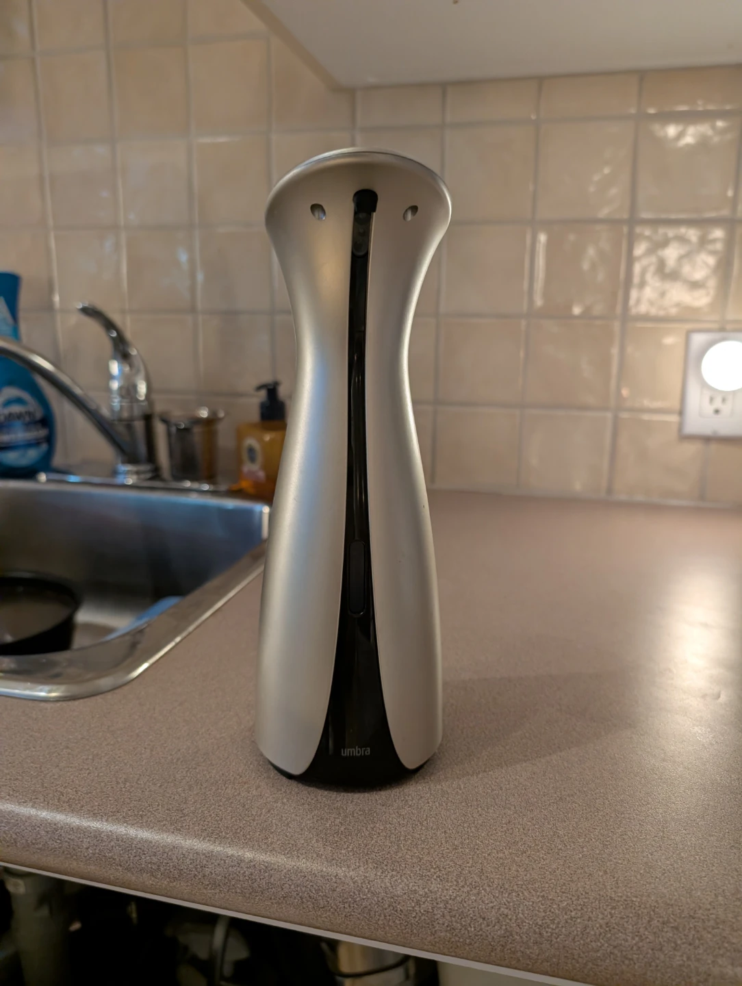Selling an Umbra Otto automatic soap dispenser. It's in great condition and works perfectly! It's a super convenient and hygienic way to dispense soap. Just pop in some AAA batteries and you're good to go