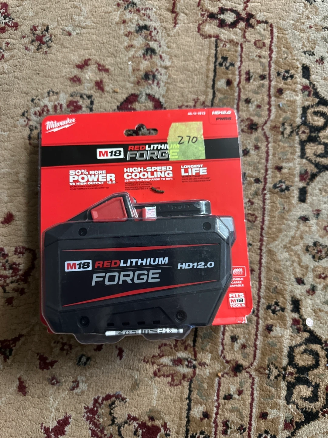 Selling a brand new Milwaukee M18 RedLithium Forge HD12.0 battery! It's never been used and comes in its original packaging. This battery offers 50% more power vs high output 12.0, high-speed cooling, and longer life. Get increased tool performance with this powerful battery!
