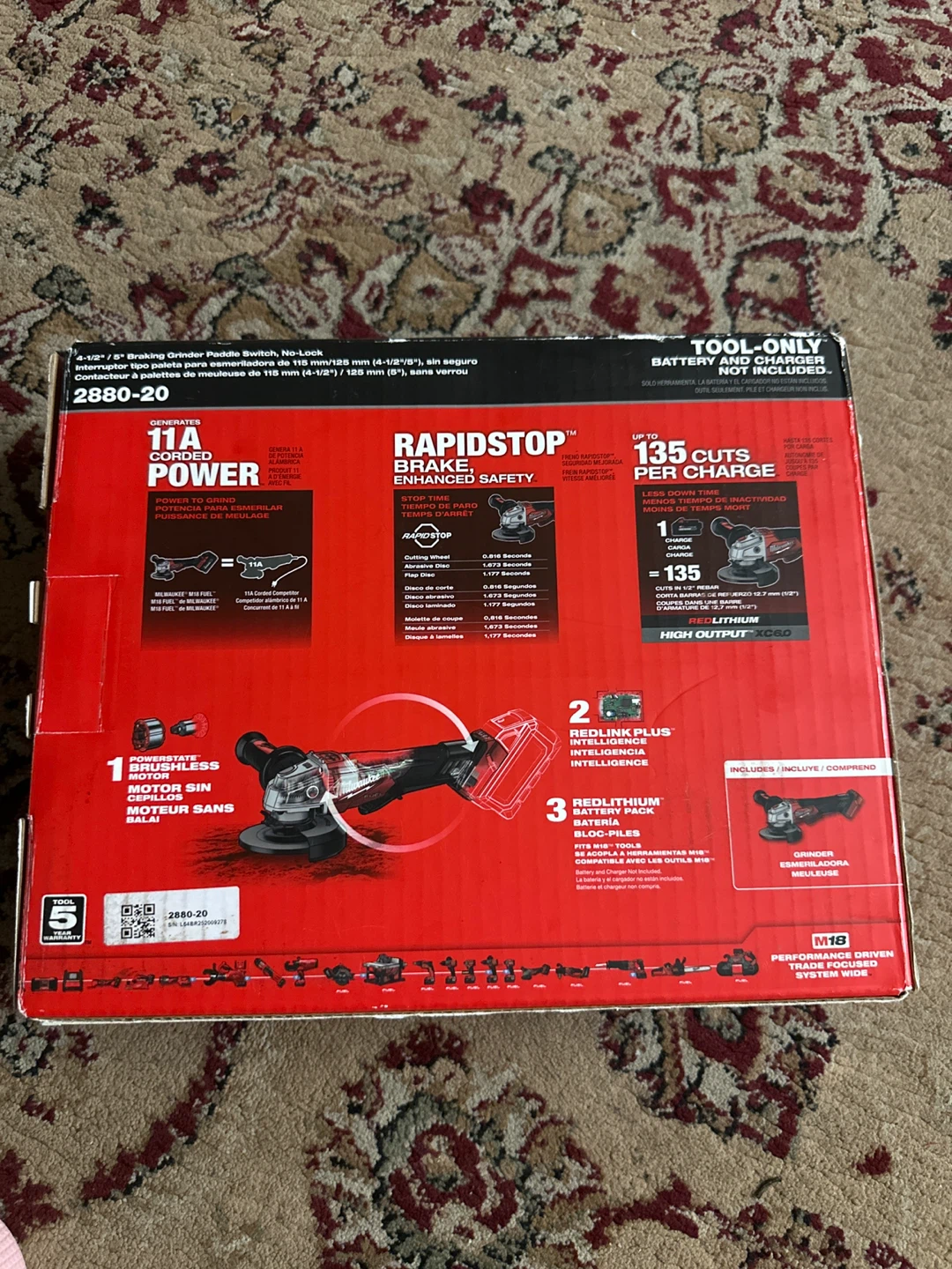 Selling a Milwaukee M18 FUEL 4-1/2" Braking Grinder Paddle Switch, No-Lock, model 2880-20. It features Rapidstop Brake for enhanced safety. Note that this is a tool-only item, meaning the battery and charger are not included