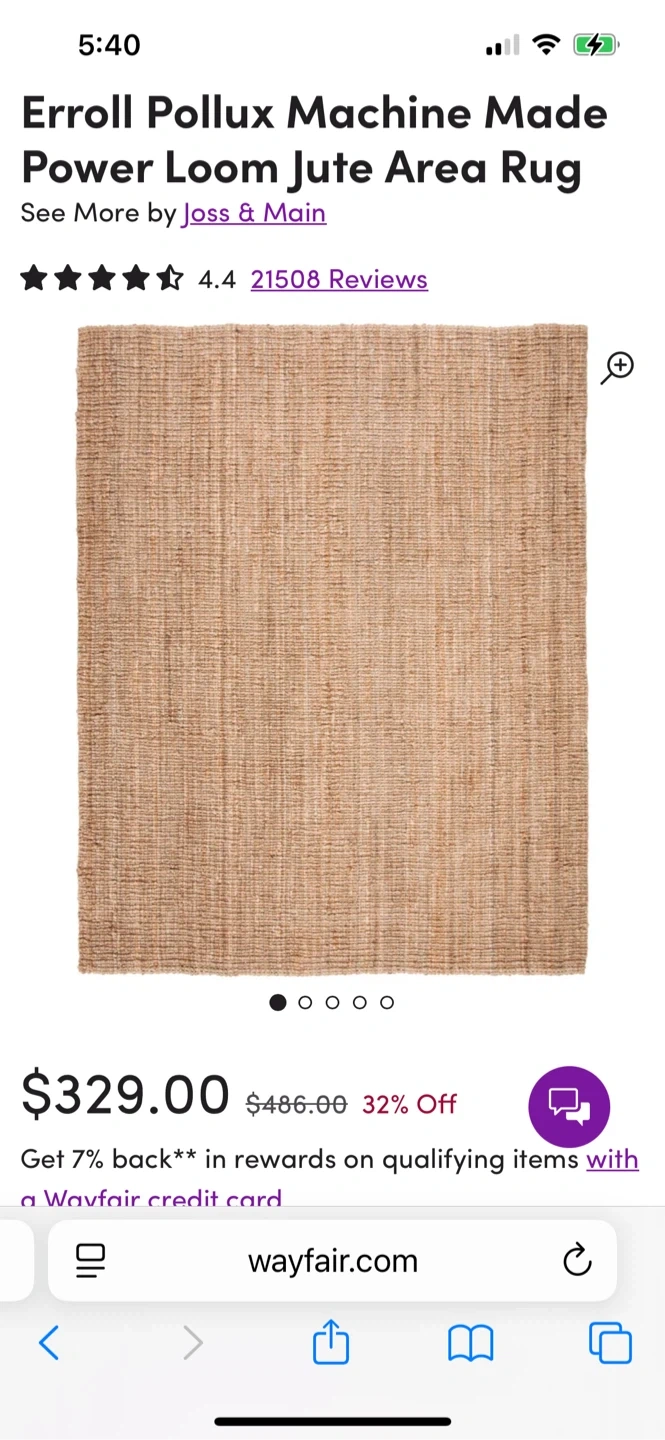 48Selling a Joss & Main Erroll Pollux jute area rug! It's in new condition and measures 6' x 9'. Originally bought for $329, this rug is a great addition to any room Bought from an auction- never used- it didn’t fit the area we wanted it to. Wrapped in cellophane - stock images from website. Pick up only please.