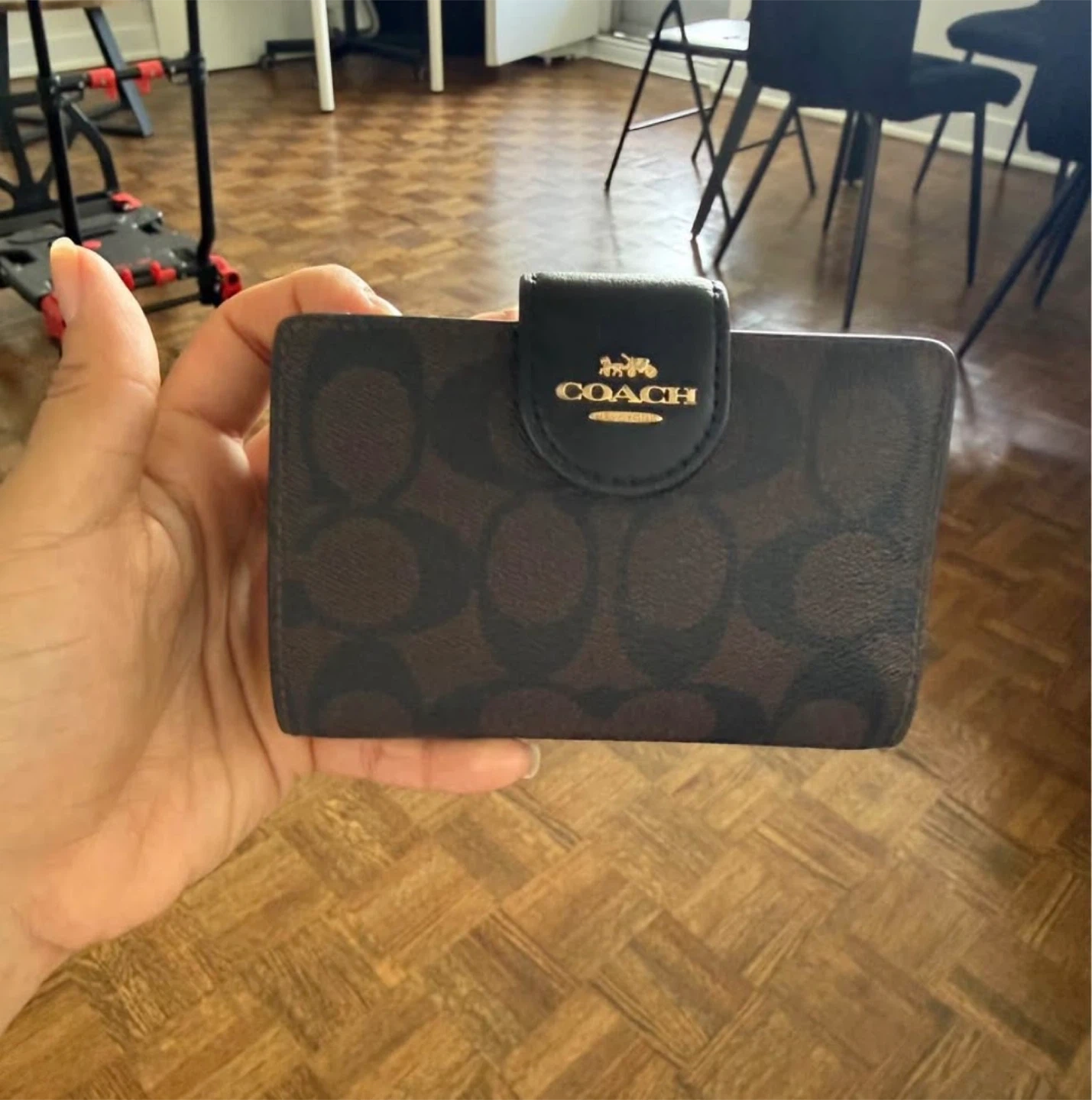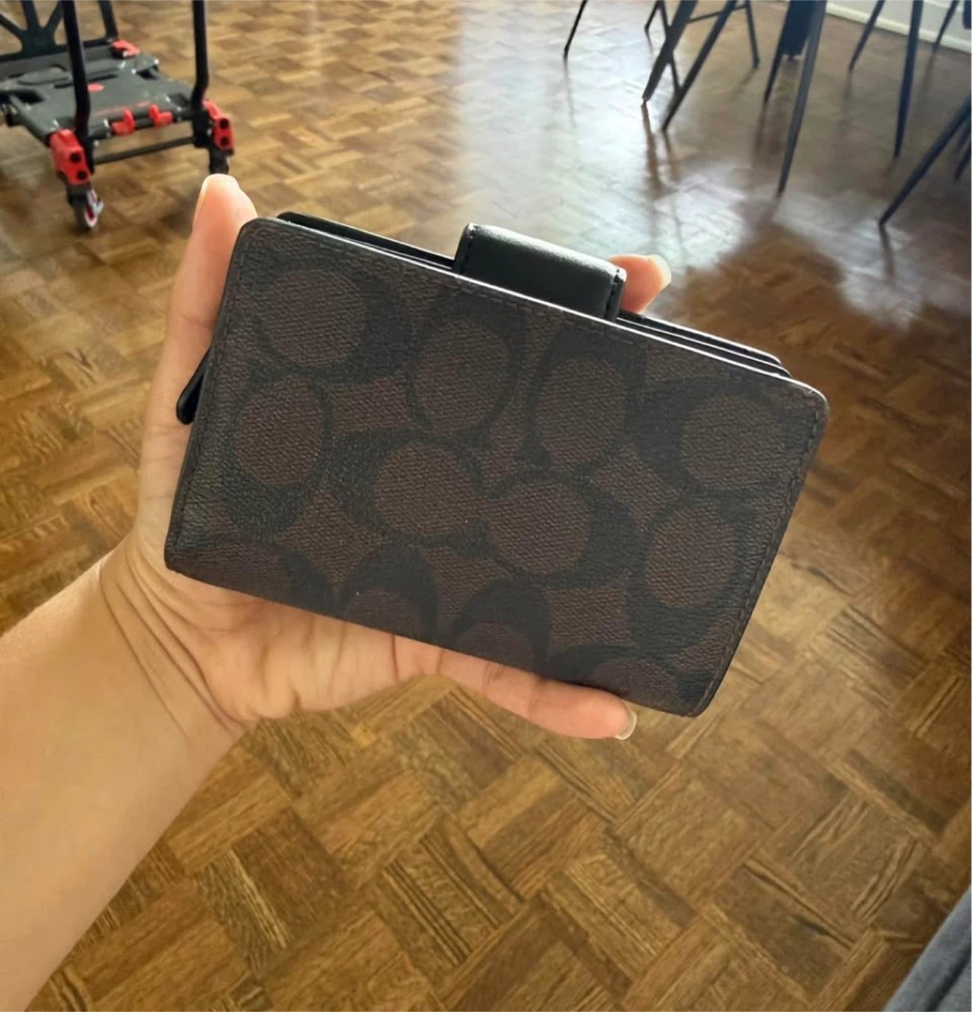Selling a gently used Coach wallet in great condition. It has a brown and black patterned exterior with a black interior. Perfect for keeping your cards and cash organized!